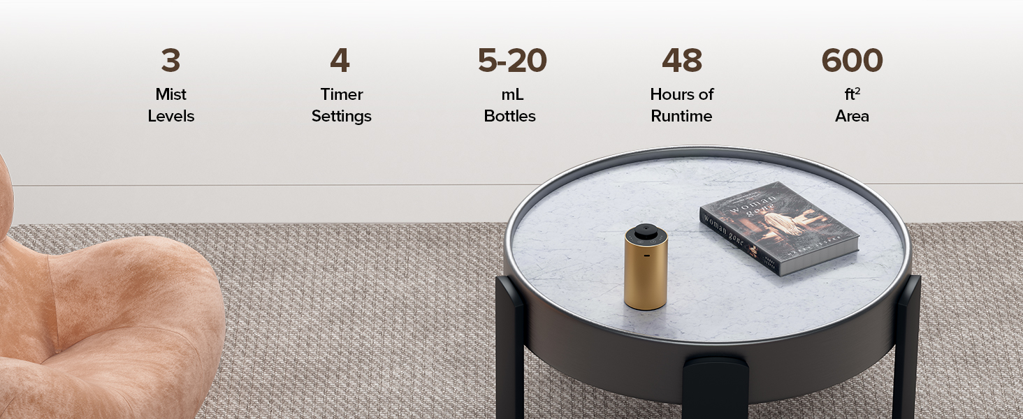 Optimized for Rooms Up to 600 sq ft. Enjoy the power of fragrance in your home, office, studio, bathroom, kitchen, or even while traveling. The intuitive touch controls offer 3 mist levels (Low/Medium/High) and 4 timer options (3 Auto-off Countdown Timers & Timer-off mode)