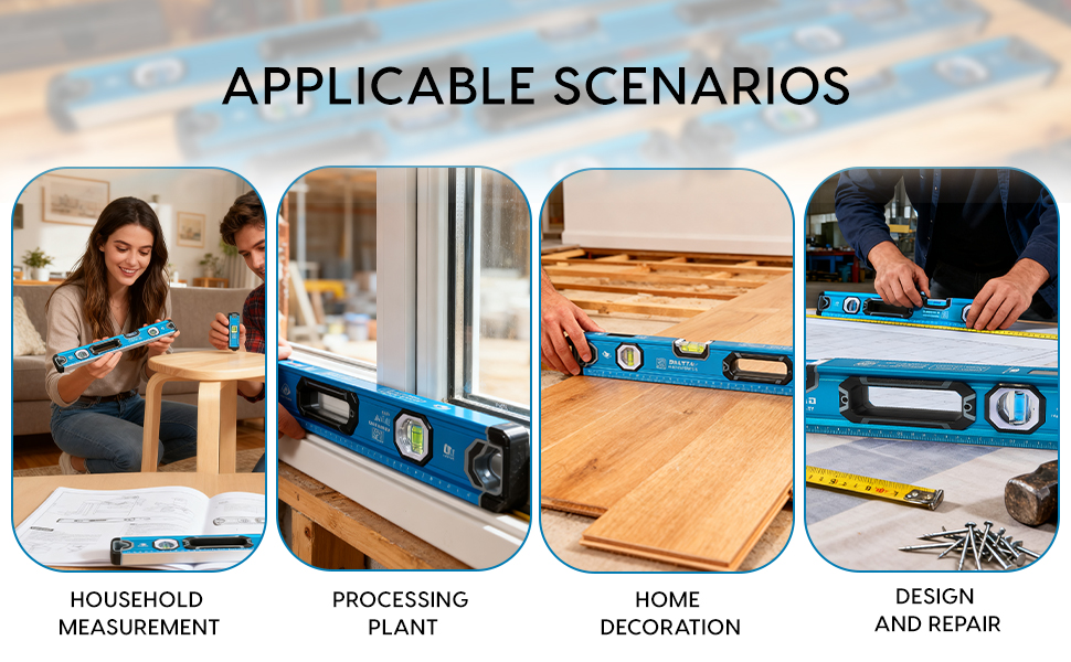 24”&40” level with open top view design, can be read from above in a confined space. This multi-purpose spirit level is designed for household furnishings and carpentry work, and can be used for decoration and home improvement projects