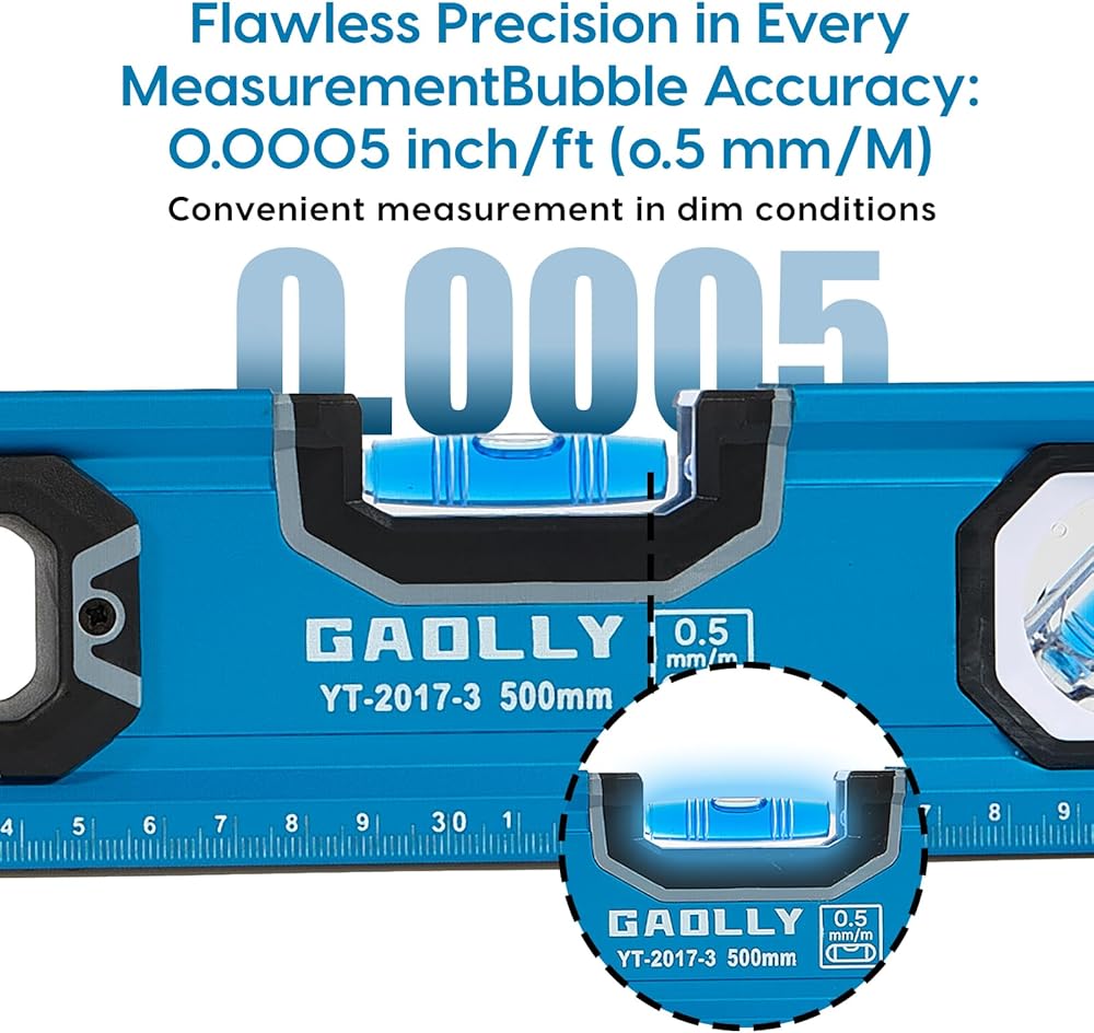 Vials of the level set provide a maximum accuracy of 0.0005-inch/ft, this will allow you to complete your project more perfectly. Easy to read leveling bubbles 45°/90°/180°of 12” & 24” level and 90°/180°level of 40” to ensure the accuracy and stability of the levels better