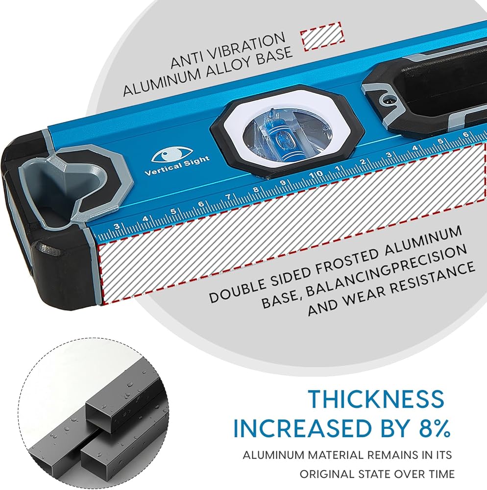 12” torpedo level is a perfect size for your portable kit and easy to use as your work, with 2 powerful magnets installed at the bottom for sticking to nearby metal surfaces. Magnetic force is greater than 2.2 lbs