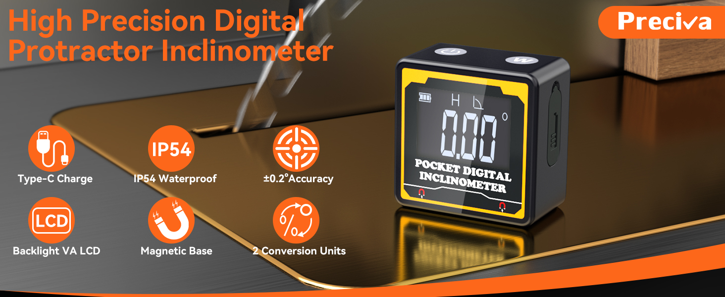 Preciva Magnetic Digital Angle Finder | 4-Sided High-Precision Inclinometer with Backlit LCD, IP54 Waterproof for Woodworking, Construction, Metal Working & DIY Projects