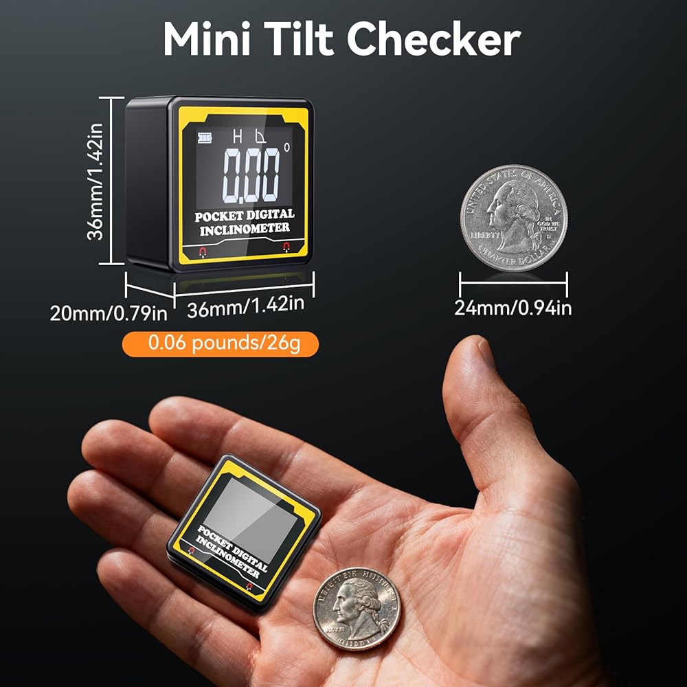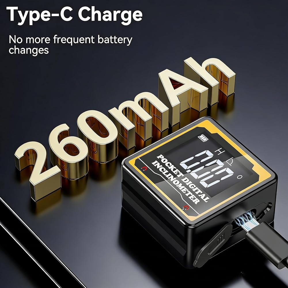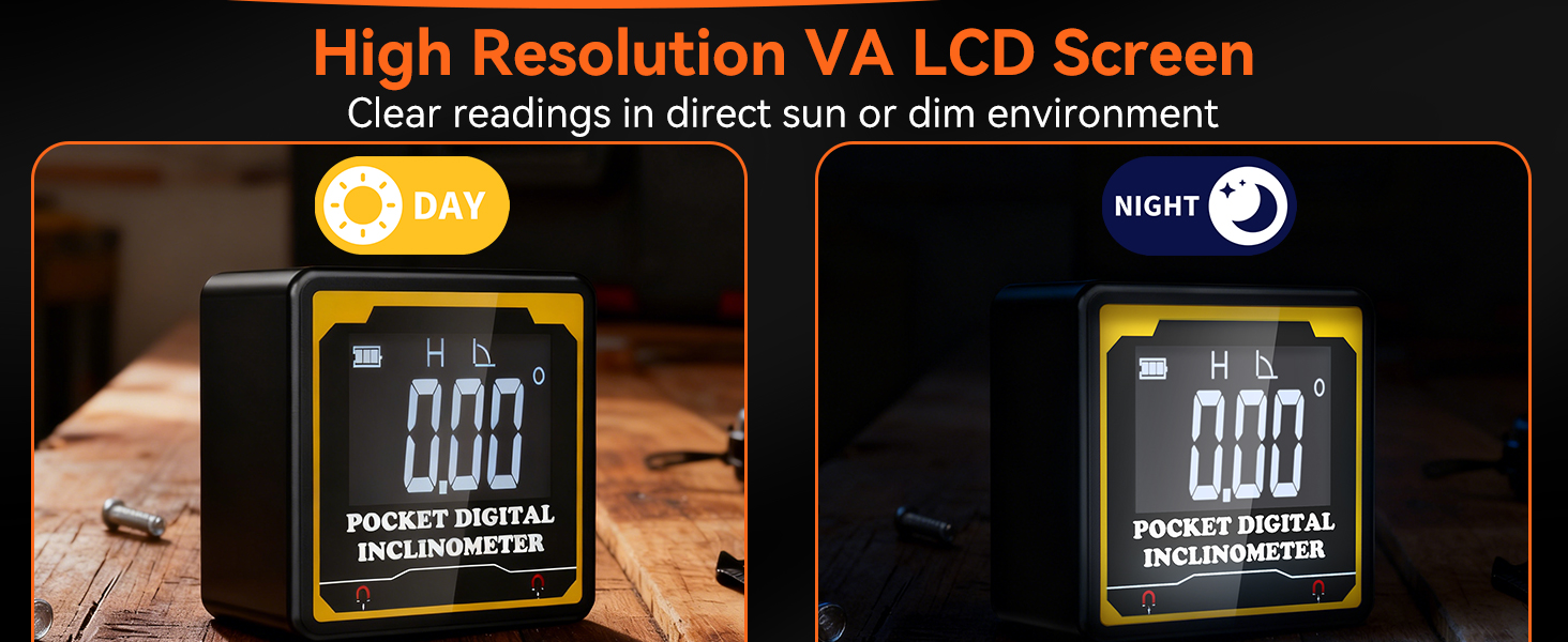 【Crystal-Clear Readings, On Any Job Site – Day or Night】Struggling to see a bubble level in dim light? Our high-contrast VA backlit display ensures 0.05° resolution is always visible in low-light conditions or bright sun. This digital protractor gives you accurate numbers at a glance—no more squinting under a dim workshop cabinet or on a bright rooftop