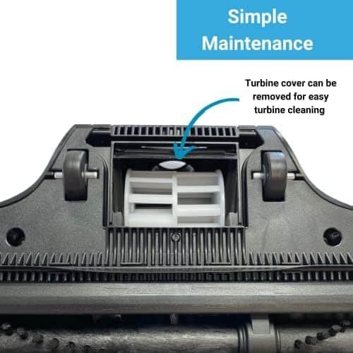 A maintainable brush chamber with a convenient cleaning flap allows easy access to remove hair, lint, and debris from the brush roller and turbine housing, helping maintain optimal performance over time. The turbine mechanism is engineered for smooth, quiet operation, providing strong agitation while minimizing vibration and noise during use.