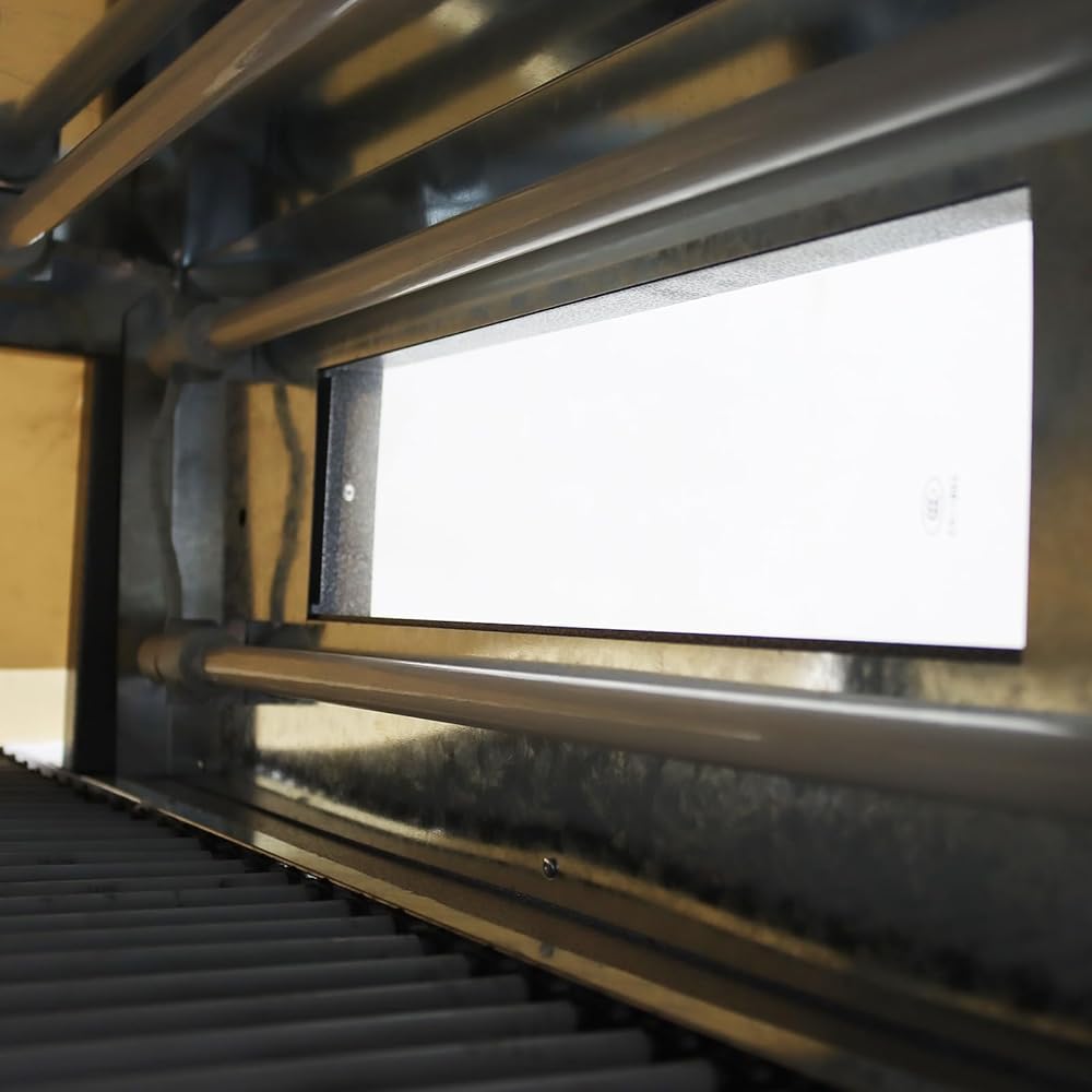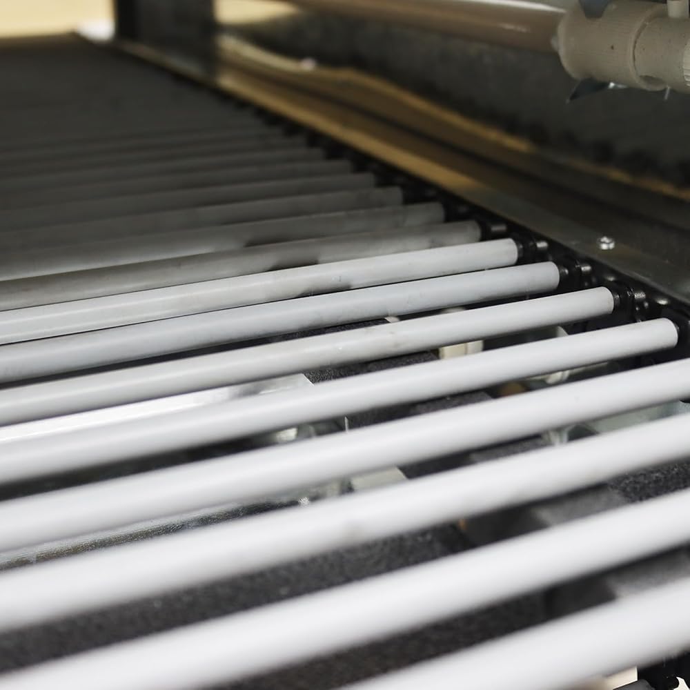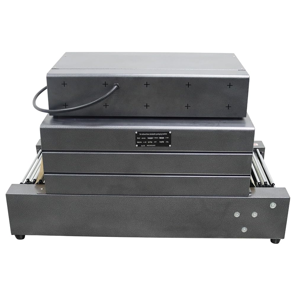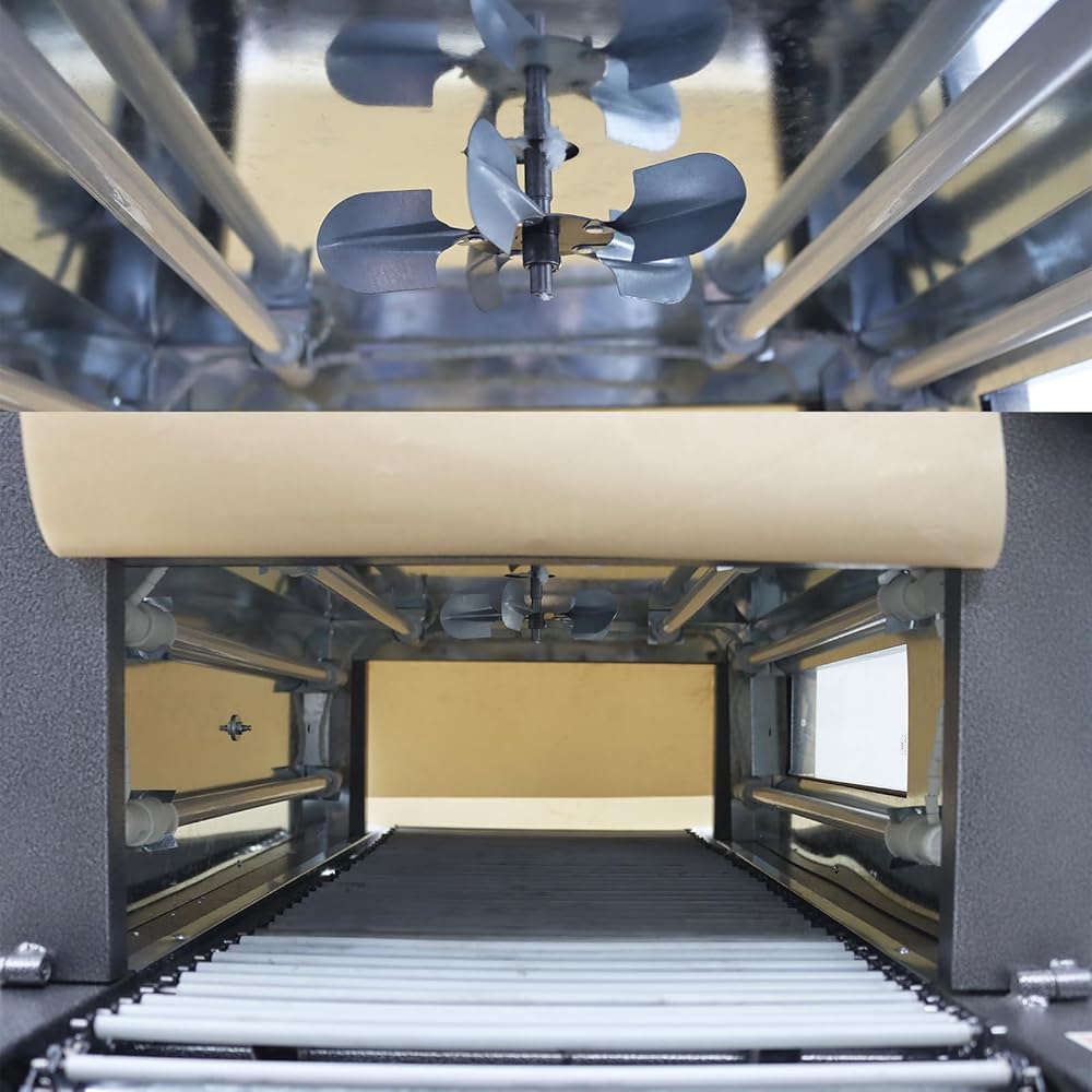 Chain Conveyor: Features a durable chain conveyor belt ideal for heavy items up to 10kg (22 lbs). The steel strip has a heat-resistant silicone tube that can isolate heat and not cause deformation of the wrapped film, ensuring a perfect shrink. The 2cm chain gaps allow even circular or awkwardly-shaped products to contract perfectly as they roll
