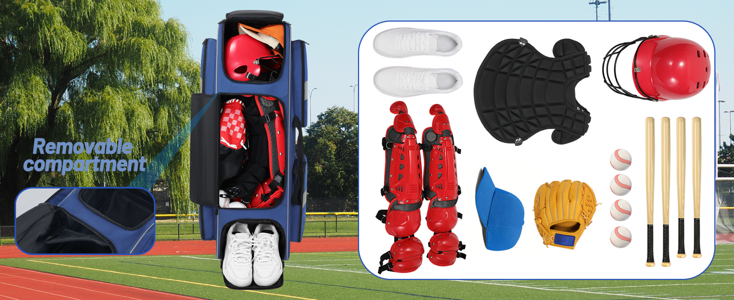 Large Capacity & Compartments: The catcher gear bag with wheel provides 70L of expansive storage, size:11"x11"x35". The bottom baseball pocket can hold up to 4 baseball bats.The catcher's gear bag features a large main compartment to hold your catcher's glove & gear, balls & helmet.