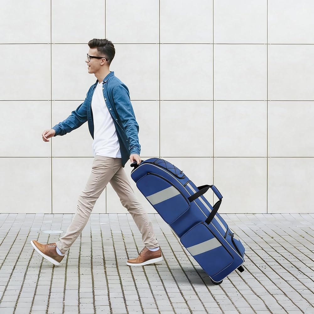 Easy to Carry: 2 hidden hanging hooks, use the 2 durable hooks inside the bag to conveniently hang the catcher bag on any chain-link fence.The roller baseball bag equipped with sturdy wheels, a padded front handle, and sturdy top handle,the bag glides effortlessly over any terrain.Reinforced base with elevated feet holds the bag upright, effectively protecting it from scratches and dirt.