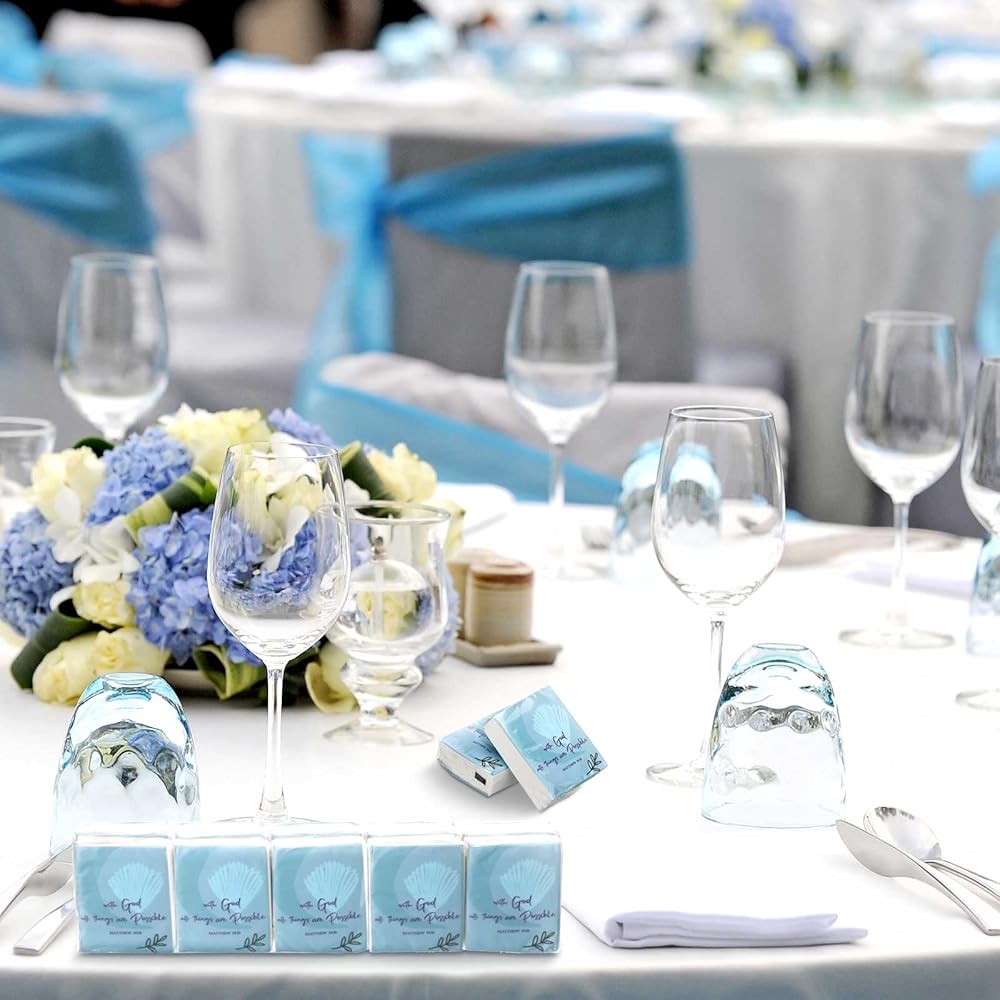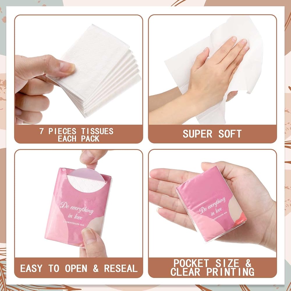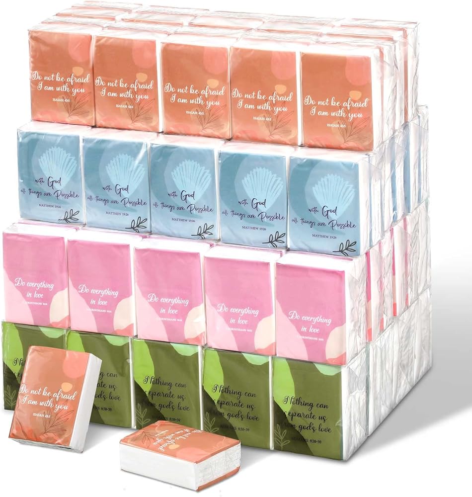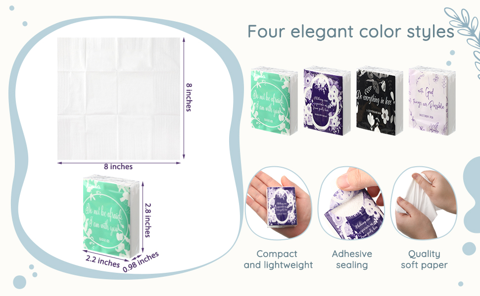Proper Size to Use: the size of the bible individual tissue packs is about 2.9 x 2.2 x 1 inches/ 7.3 x 5.5 x 2.5 cm, the unfolded size of each tissue is about 8 x 8 inches, appropriate and convenient for you to use; These bible travel tissue packs can be applied for desserts, sandwiches, cookies, appetizers and more
