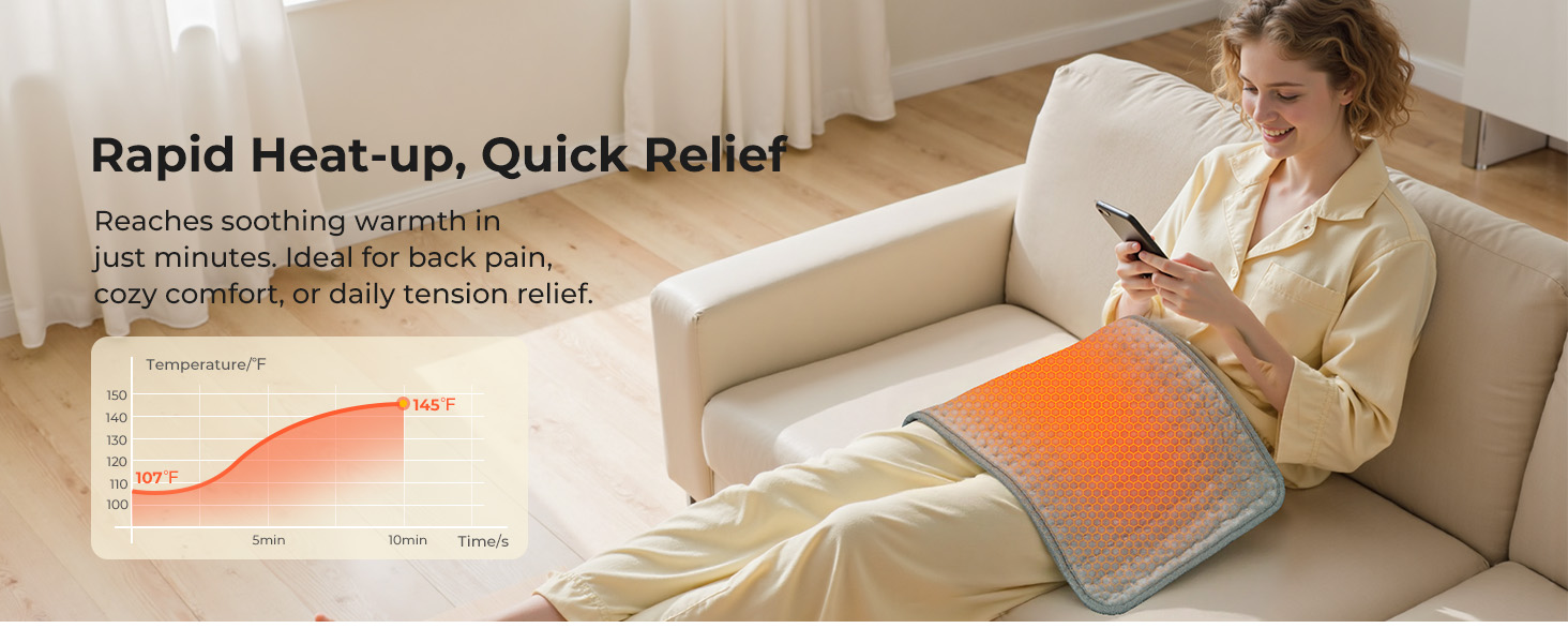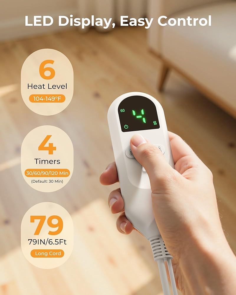Rapid Relief, Customized Warmth: Feel the warmth in seconds with 6 adjustable levels (104–149°F) and 4 timers (30–120 min, default: 30Min). Whether you prefer gentle warmth or stronger heat, you're in control—customize your comfort with one-touch ease.