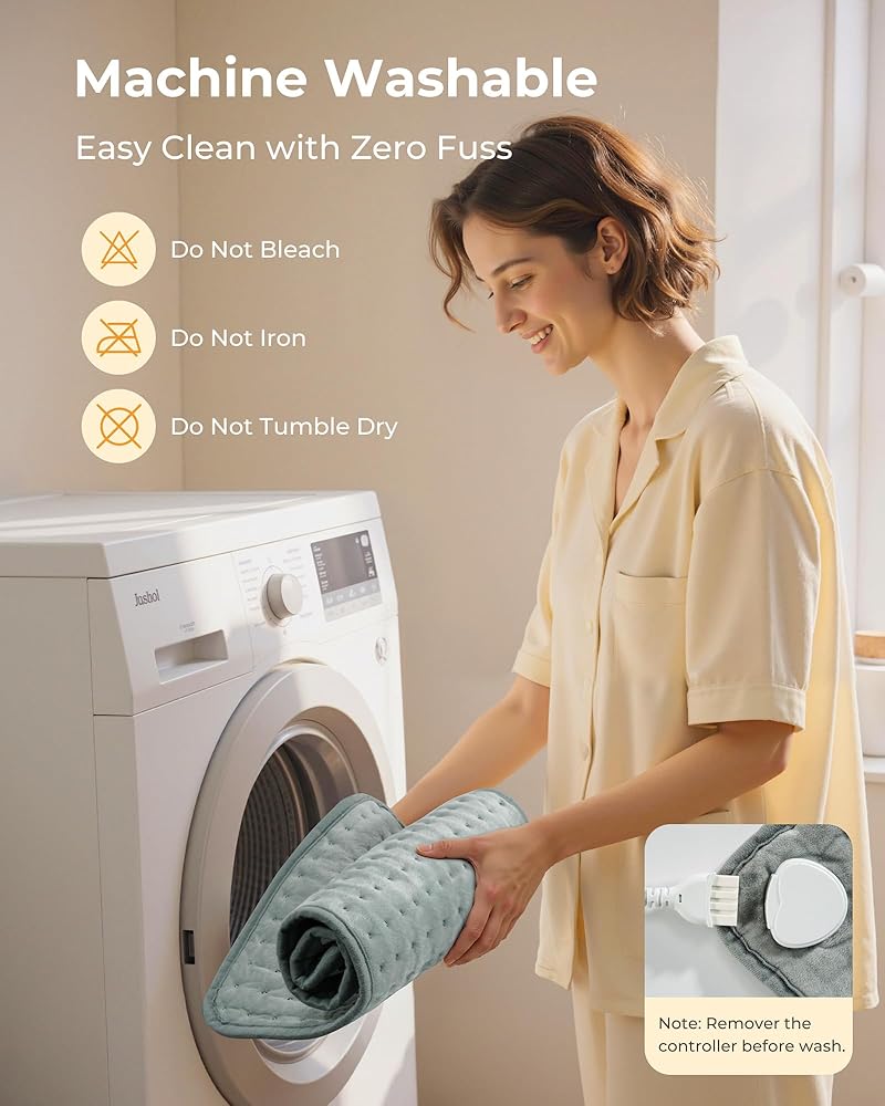 Easy to wash: Cleaning has never been easier. The heating pad is machine washable—just remove the controller and toss it in the wash. Enjoy hassle-free care and lasting comfort, use after use, without worrying about stains or buildup.