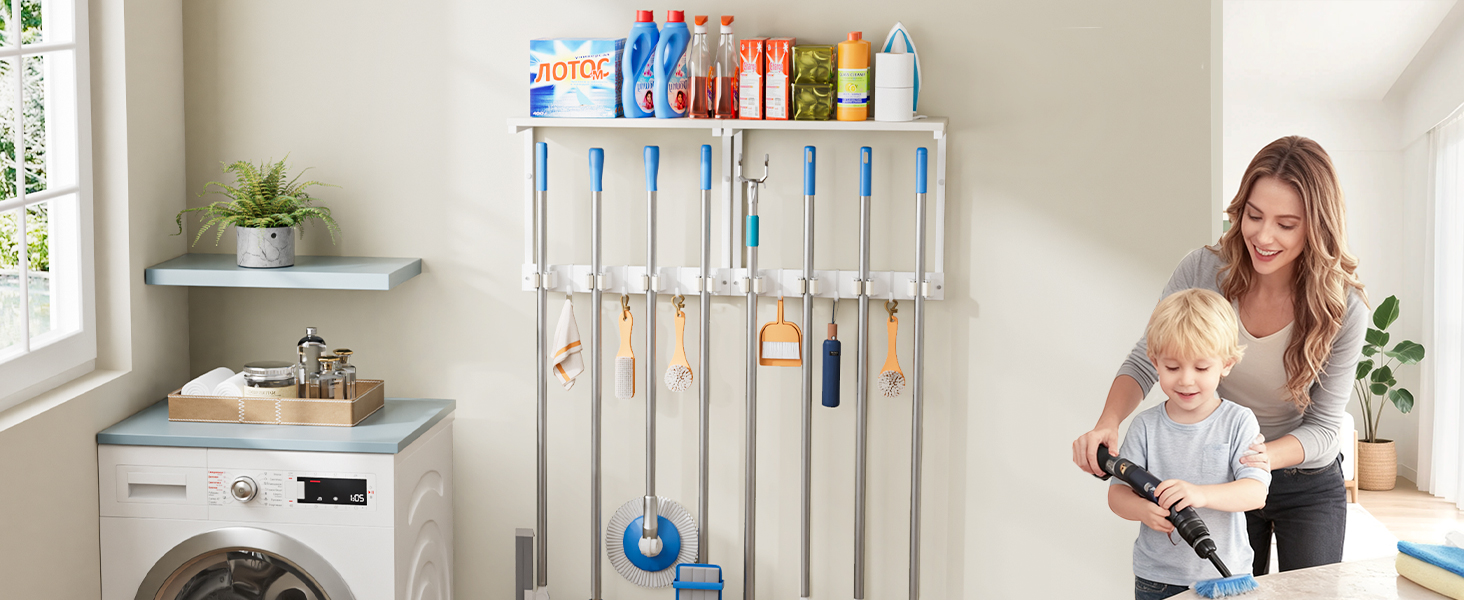 【Built to Hold More】Designed with an expanded, high-capacity layout, this broom hanger wall system comfortably stores a full range of cleaning tools and supplies in one place. Multiple reinforced broom clips secure long-handled items, dedicated hooks support accessories, and the wide top shelf holds bulkier essentials—so even a fully equipped cleaning setup fits with ease.