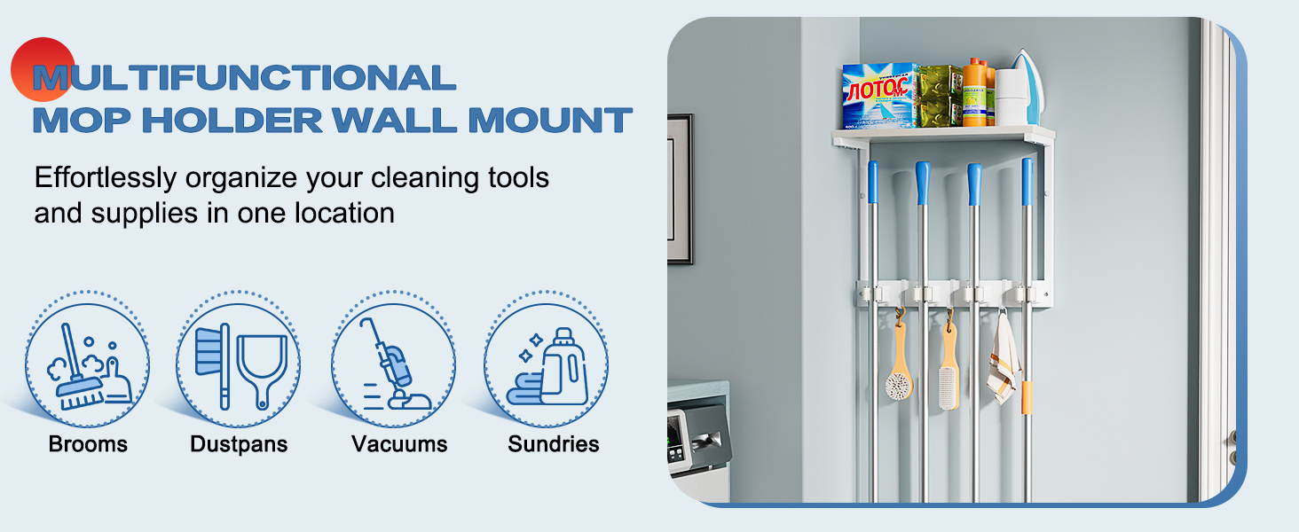 【Strength You Can Trust】Built with reinforced clips and a solid metal-and-wood structure, this mop holder wall mount handles real household weight with confidence. Heavy and full spray bottles, and loaded caddies stay firmly supported—stable, reliable, and made for long-term use.