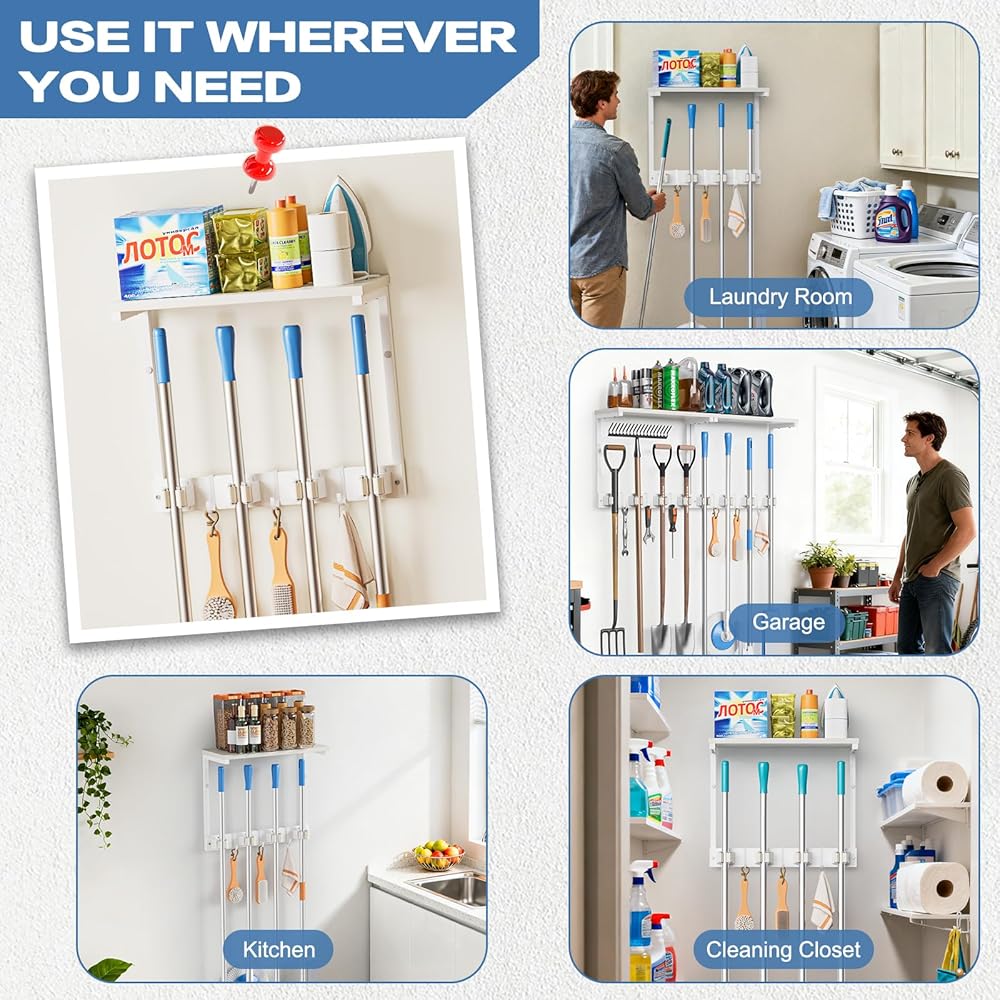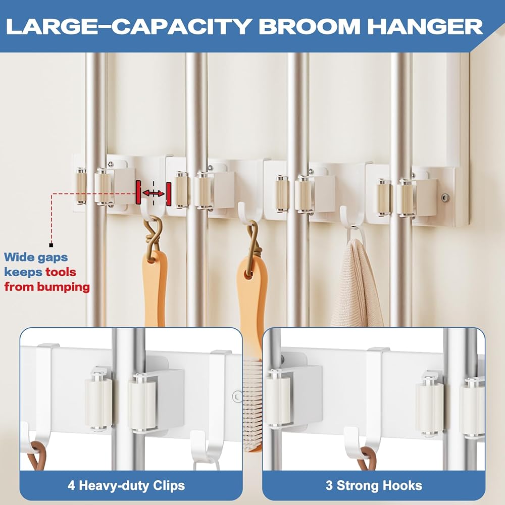 【Designed for Real Homes】Perfect for laundry rooms, utility spaces, garages, kitchens, or apartments, this wall-mounted broom organizer system turns overlooked wall space into a functional upgrade. It keeps floors clear and spaces feeling cleaner, calmer, and more intentional.