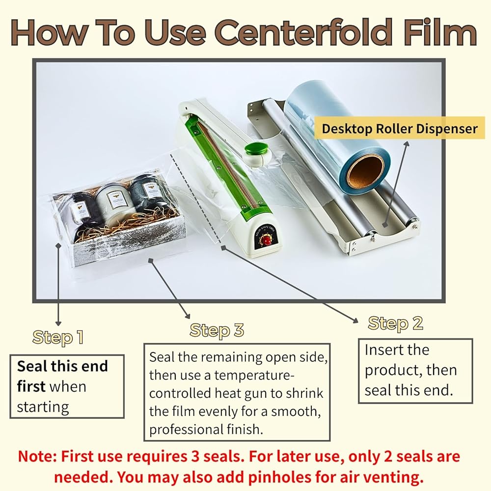 Complete Shrink Wrap Bundle – Includes one 45cm Desktop Shrink Wrap Film Roller Dispenser and one roll of 12" x 500' 75 Gauge PVC Centerfold Shrink Wrap Film. Perfectly matched for hassle-free packaging. (Please note: Suggest using a heat sealer and an adjustable heat gun)