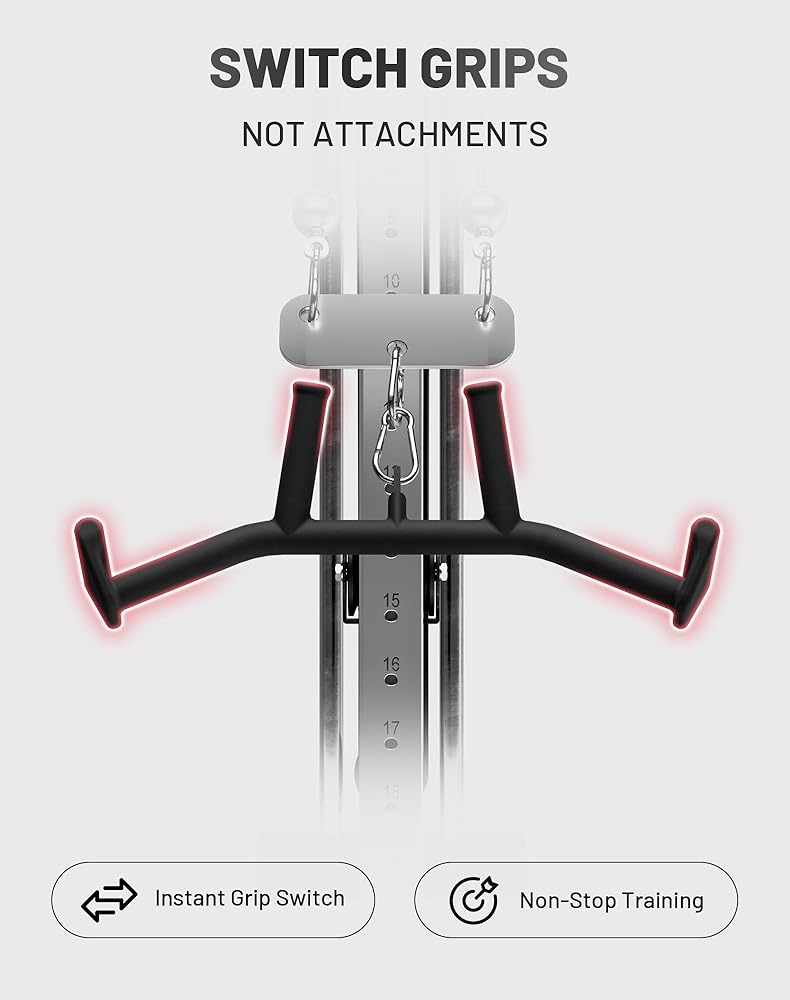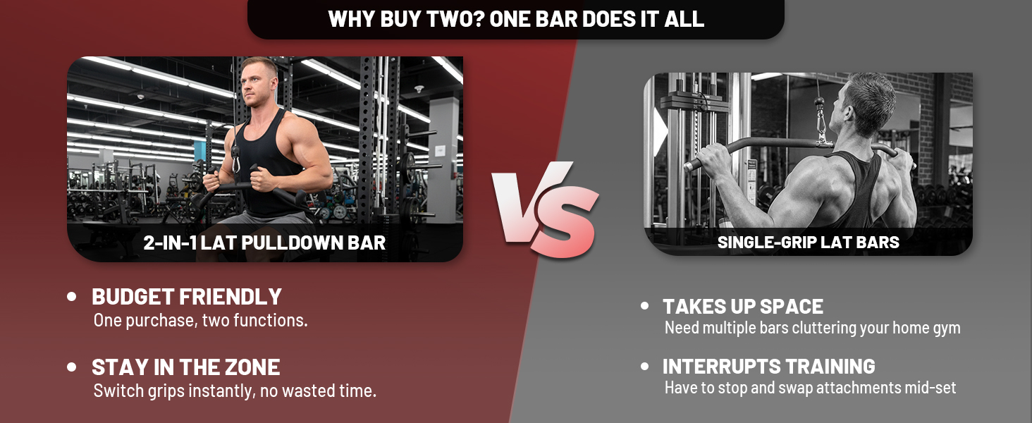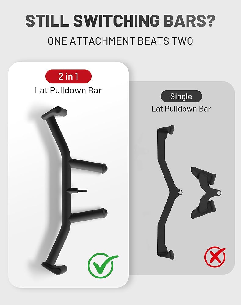 2-in-1 Design for Smarter Training:Switch easily between wide and narrow grips in one lat pull down bar—no need to change lat pulldown attachments mid-workout. Keep your rhythm and training intensity for more efficient back and upper-body sessions in any home gym