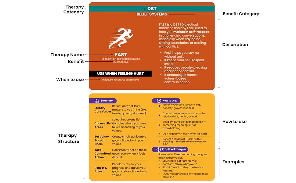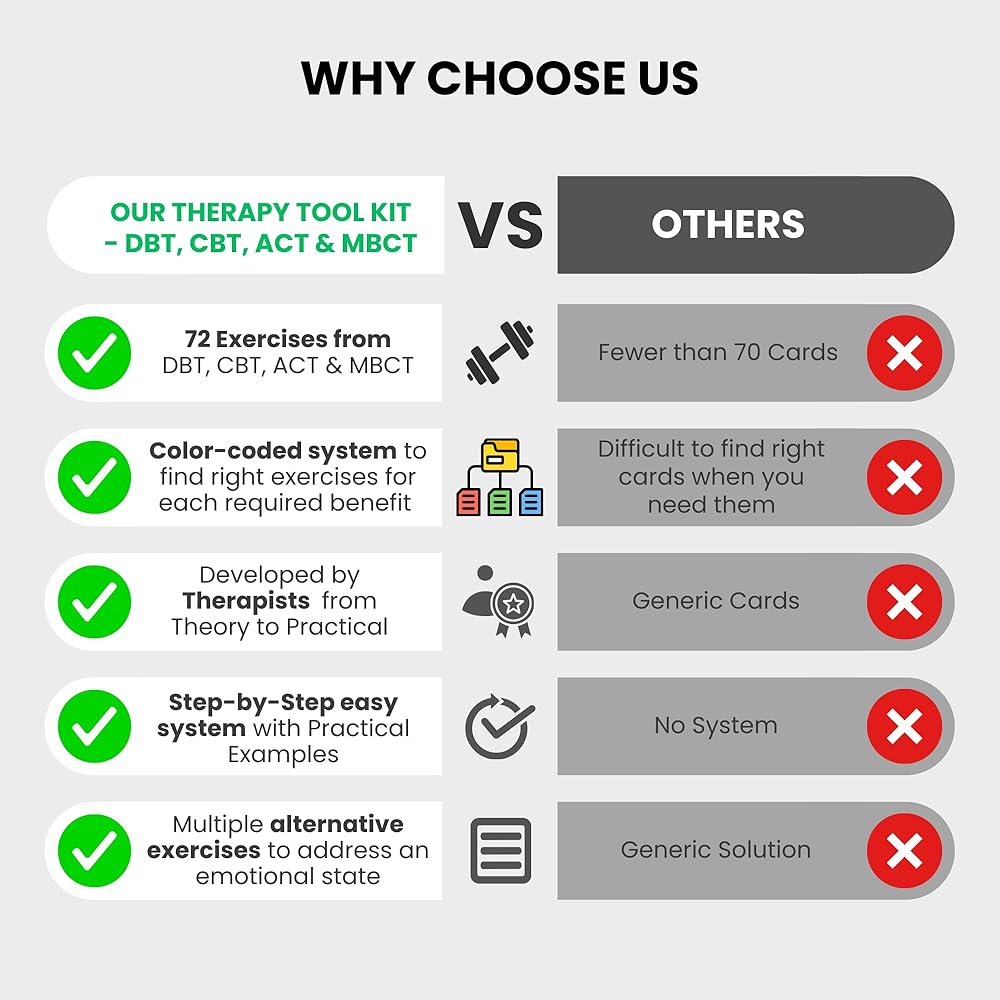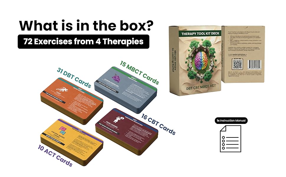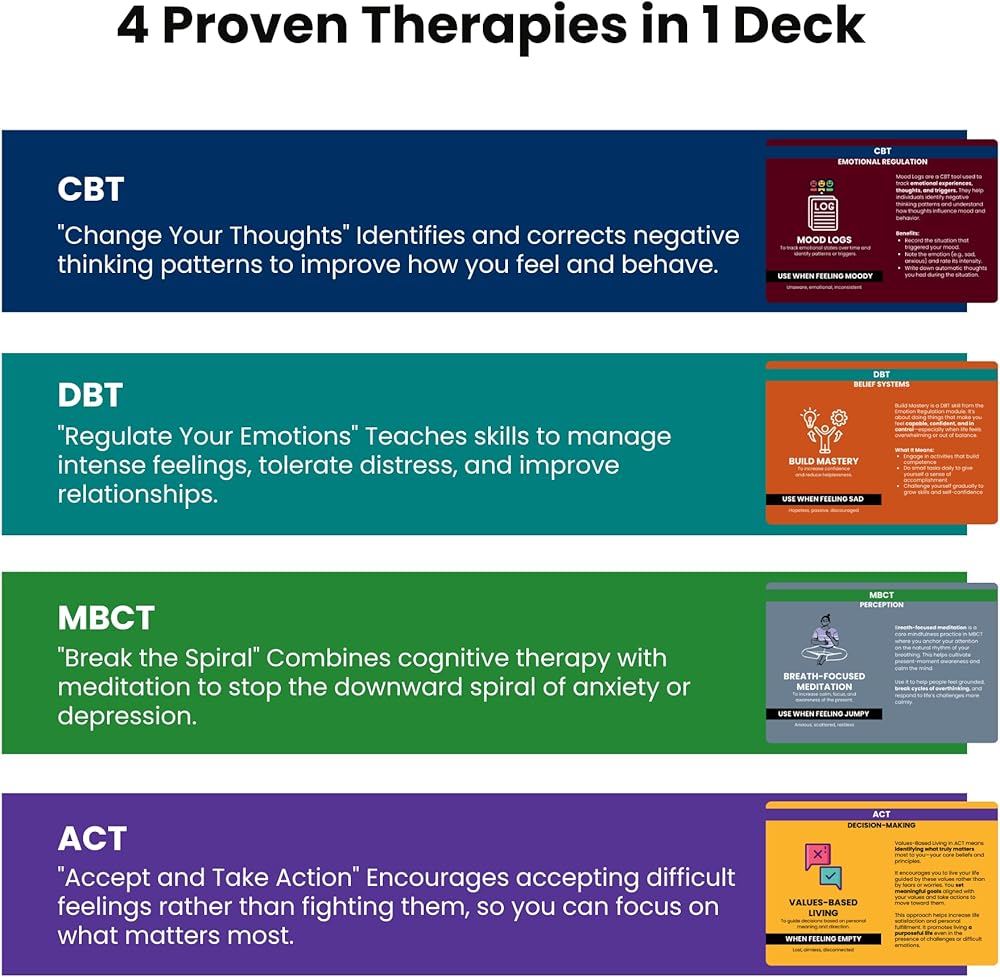 COMPLETE 4-IN-1 TOOLKIT: Integrates DBT, CBT, ACT, and MBCT into one therapy card deck. A versatile mental health resource that goes beyond a standard DBT deck to address diverse needs.