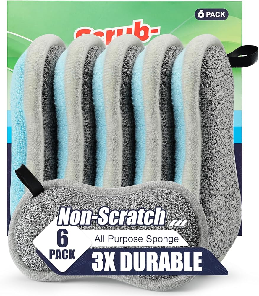 1. Dual-Sided Power for Every Cleaning Task:Experience the ultimate kitchen duo in one sponge! The soft, non-scratch microfiber side gently cleans delicate dishes, glasses, and countertops. Flip it over to the rugged, efficient scrubber side to effortlessly tackle baked-on grime on pots, pans, and even delicate non-stick cookware without causing damage.