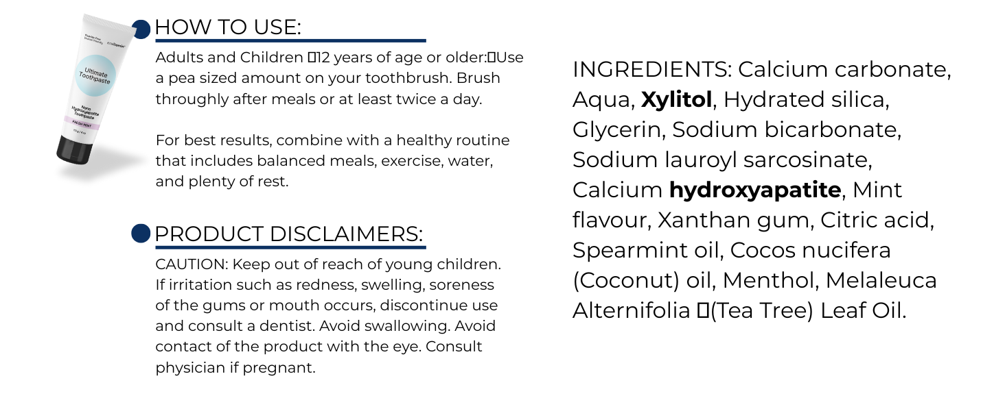 Nano Hydroxyapatite (n-HA) - the same ingredient that naturally makes up 97% of your teeth material, and carefully selected naturally sourced and naturally derived ingredients. We eliminated the fluoride and replaced it with this biocompatible ingredient to remineralize your enamel, reduce teeth sensitivity and naturally whiten.