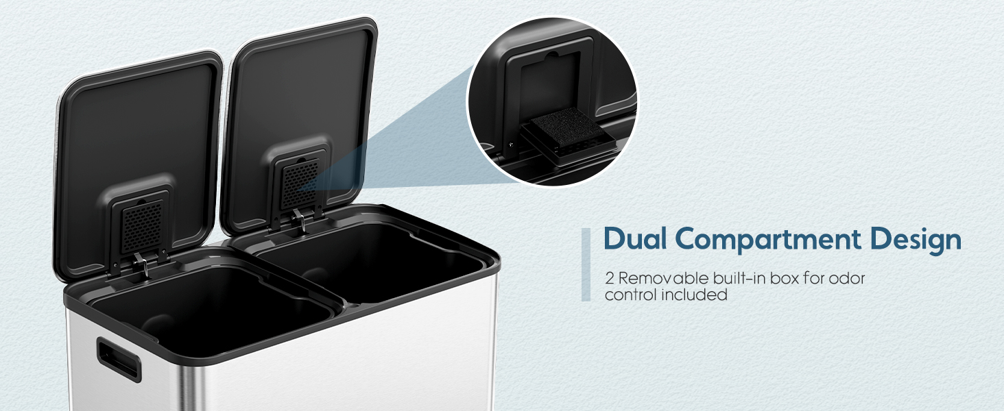 Odor Control :Trash and recycle bin combo includes a removable built-in box for odor control, preventing odors from escaping. Sealed lid and bag holder hole make sorting trash and recycling simple and tidy, creating a cleaner and tidier living space