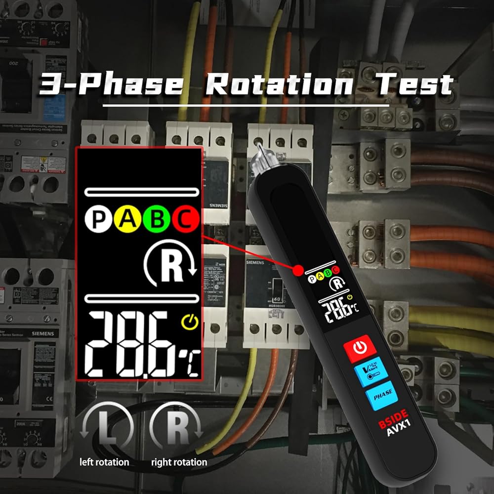 [3-Phase Rotation Tester]: Non-contact voltage tester integrated 3-phase rotation meter, it can shows “L” (left) rotation or “R” (right) rotation, very convenient for your work.