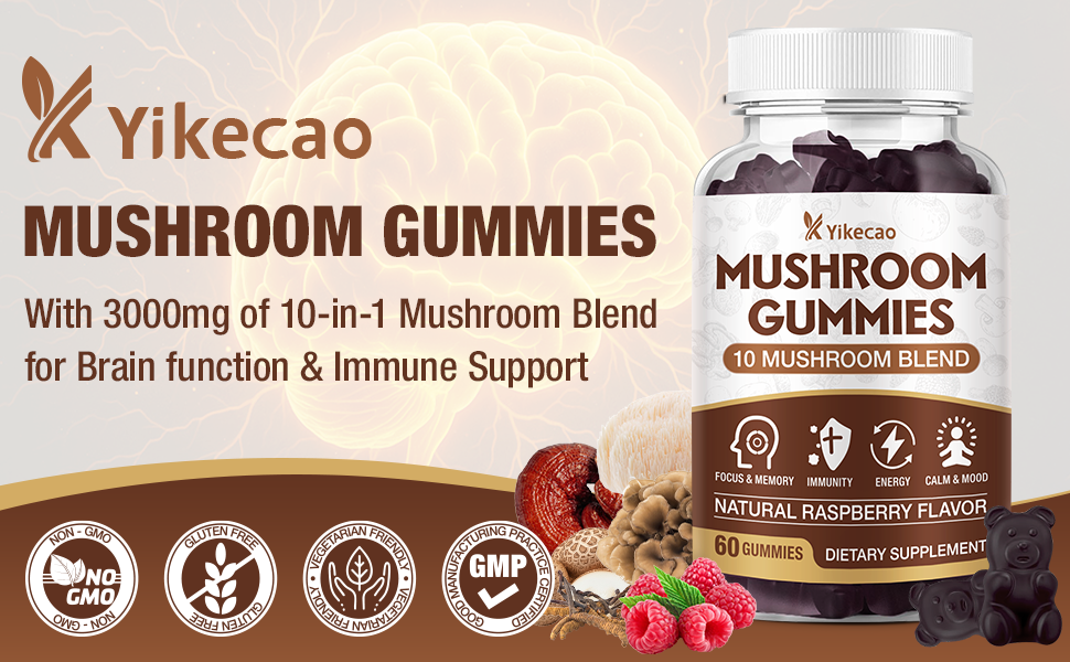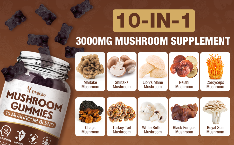 10-Mushroom Complex: Our mushroom gummies feature a blend of 10 mushroom extracts, including Lion's Mane, Reishi, Cordyceps, and Chaga, Maitake, Shiitake, Turkey Tail, White Button, Black Fungus, Royal Sun.
