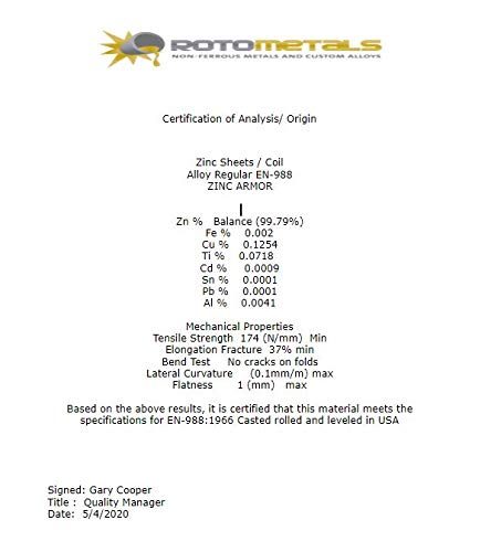 Zinc Sheet - .027" x 8" x 11" cut sides are +/- 1/8". Thickness best for vertical applications such as walls, doors and backsplashes. A direct replacement for lead, zinc provides nonsparking and nonabrasive properties. Over time, a corrosion- and weather-resistant film develops on its surface. Material is often used in stamping, sound deadening, and EMI/RFI shielding applications. Melting temperature is 785° F. Thickness tolerance is ±0.005”. Due to the nature of product, some scratches and blemishes should be expected. Metal sheets, just like their antique counterparts, may contain a certain amount of flaws, smudges, and scratches especially after shipping. Most of these marks can be buffed out using 0000 Steel Wool once the sheet is installed.