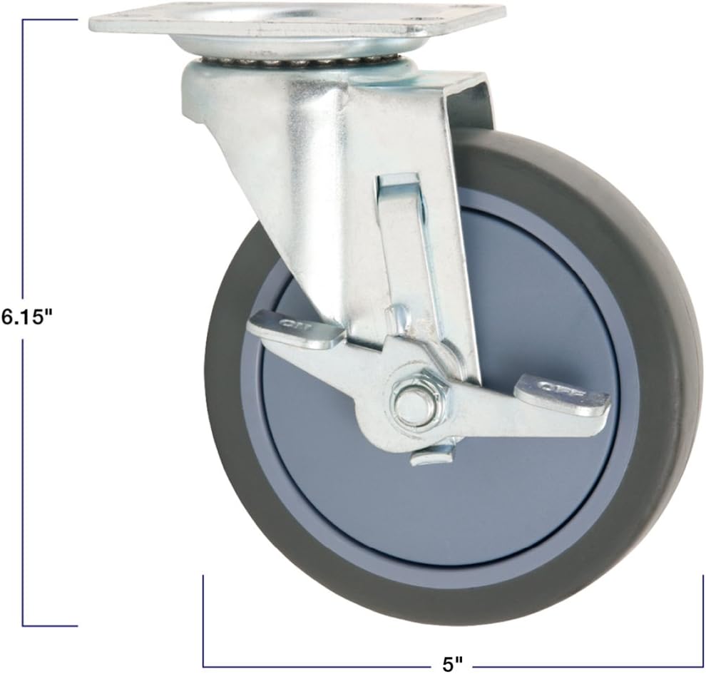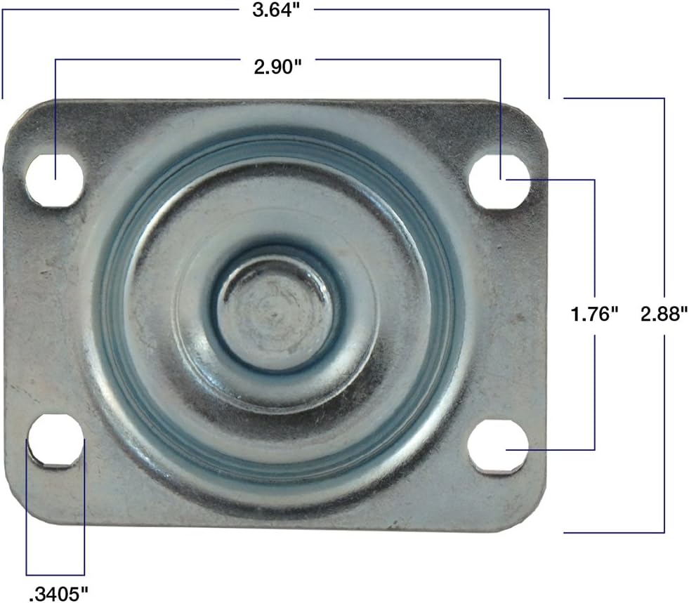 This type of caster features gray non-marking injection molded rubber that is mechanically and chemically bonded to the hub. They are especially suited for use in Pharmaceutical Laboratories, Hospitals, Food Service and other Institutional applications. The wheels provide a softer ride than polyurethane and yet withstand exposure to many chemicals and solvents. The top mounting plate for this caster is 3.64” by 2.88”. The bolt pattern, which is the distance between each installed bolt, is 2.90” by 1.76”. The diameter of each bolt hole is 0.3405”. When this caster is installed, it adds an additional 6.15” of overall height to the item you are attaching it to.