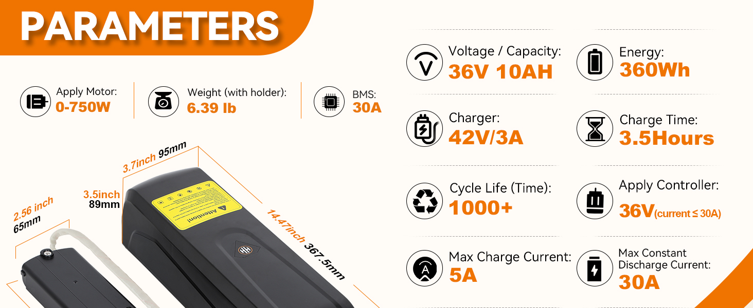 -🏅-【36V 10AH Ebike Battery Parameter】▶30A BMS,Max constant discharge current:30A.your controller must be rated at ≤30A.otherwise the battery won't work properly.▶Battery size:14.47*3.7*3.5 inches,Weight: 6.39 LBS.Before purchasing, confirm whether the size of the battery is suitable for your attery space to reduce unnecessary returns.▶Battery base & discharge cable:5Pin b attery base with female XT60 discharge cable,Note the orientation of the 5-pin.Not a 4-pin battery holder.Please check to see if your battery base is the same.▶Check if your controller is in the base of your original battery, our battery base cannot hold the controller.