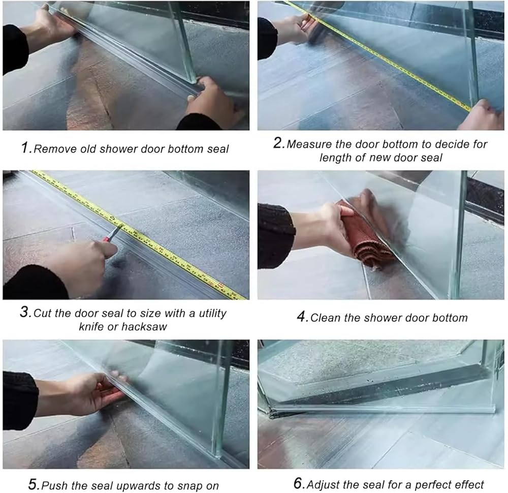 5 Segmented installation: The bottom seal of the frameless shower door is installed in 5 sections, with each section being 15.75 inches long. The excess length of the sealing strip of the glass shower door can be cut off as needed, and then each section of the sealing strip can be installed.If the quantity of the products received is incorrect, please contact us.
