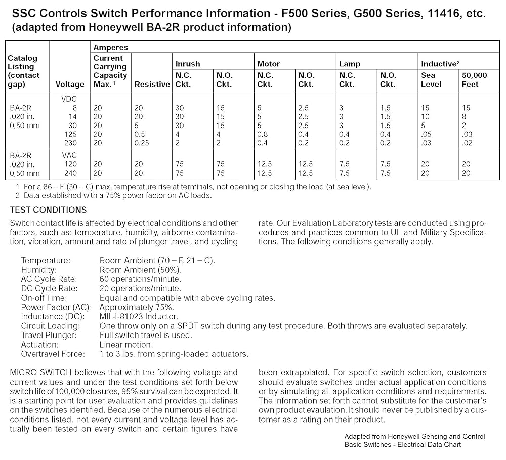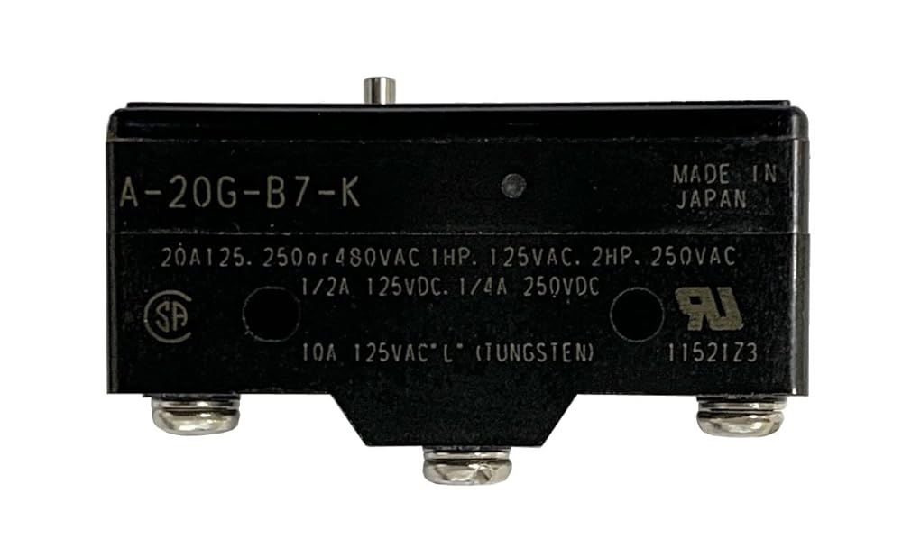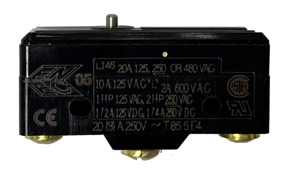 Electrical switch with pin plunger. Includes #6 screws for the terminals and two mounting holes on the switch. Replacement for G-Series G500 models (SPDT models), as well as each switch for G502 models (2 required) and G503 (3 required). Fits SSC models G500-MO, G500-MA, G500-AT, G502-MO (2 required), etc., and SSC F500 foot switch models. Also is a replacement switch for 534-SS, JLG switch 7000625 (contact block), JLG 70002902, Honeywell BA-2R62-A4, and BA-2R-A2. This is a high-capacity switch capable of handling 20 A loads with large inrush currents. The product you receive will be Honeywell BA-2R-A2 or Omron A-20G-B7-K (they are interchangeable).