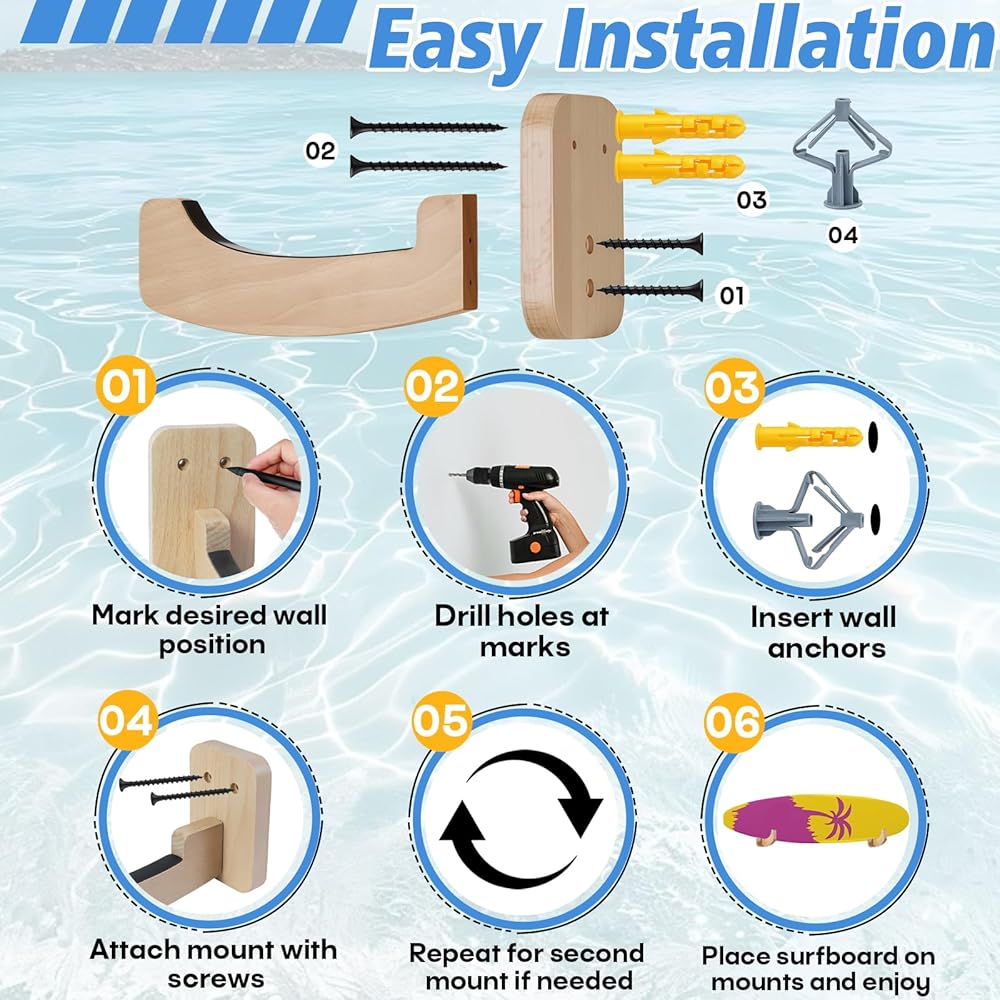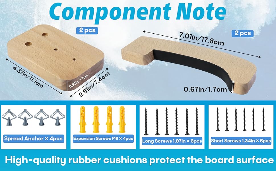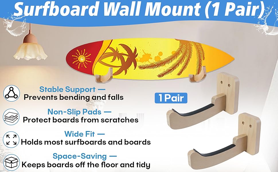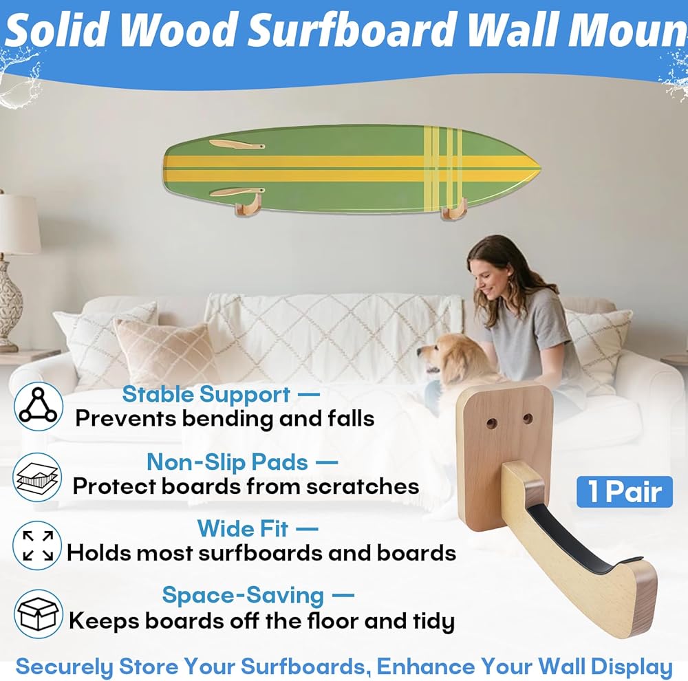 Solid Wood Construction & Stable Support: Made from durable solid wood with a reinforced mounting structure, this surfboard wall mount delivers reliable, long-term support. Designed to handle repeated loading without bending or loosening over time