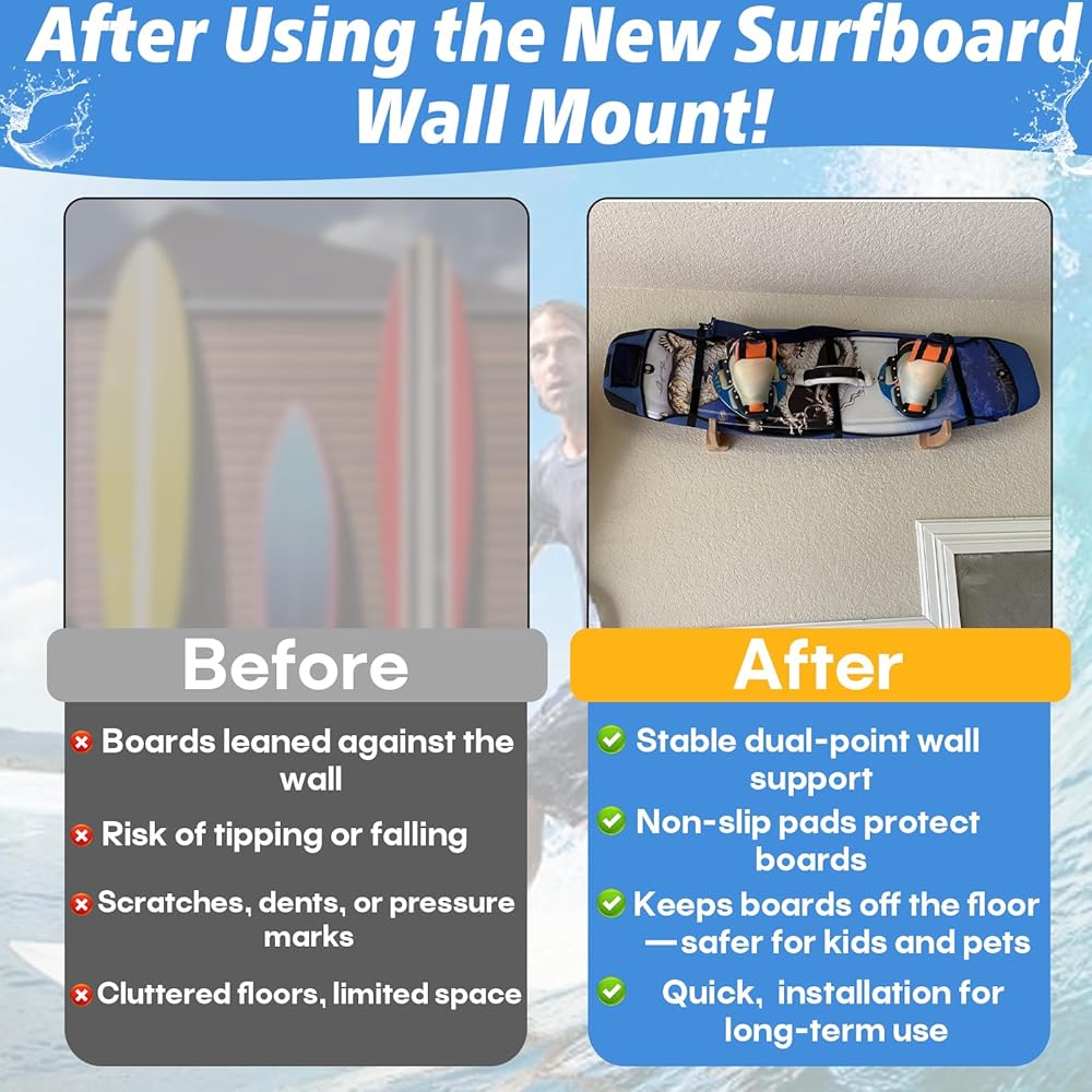 Easy Installation with Secure Dual-Point Mounting: Dual-point support helps distribute weight evenly for a firm, stable mount that stays securely in place after installation. Keeps boards fully off the floor, reducing the risk of slipping, tipping, or accidental impact that can occur with traditional wall-leaning storage—safer for boards, kids, and pets