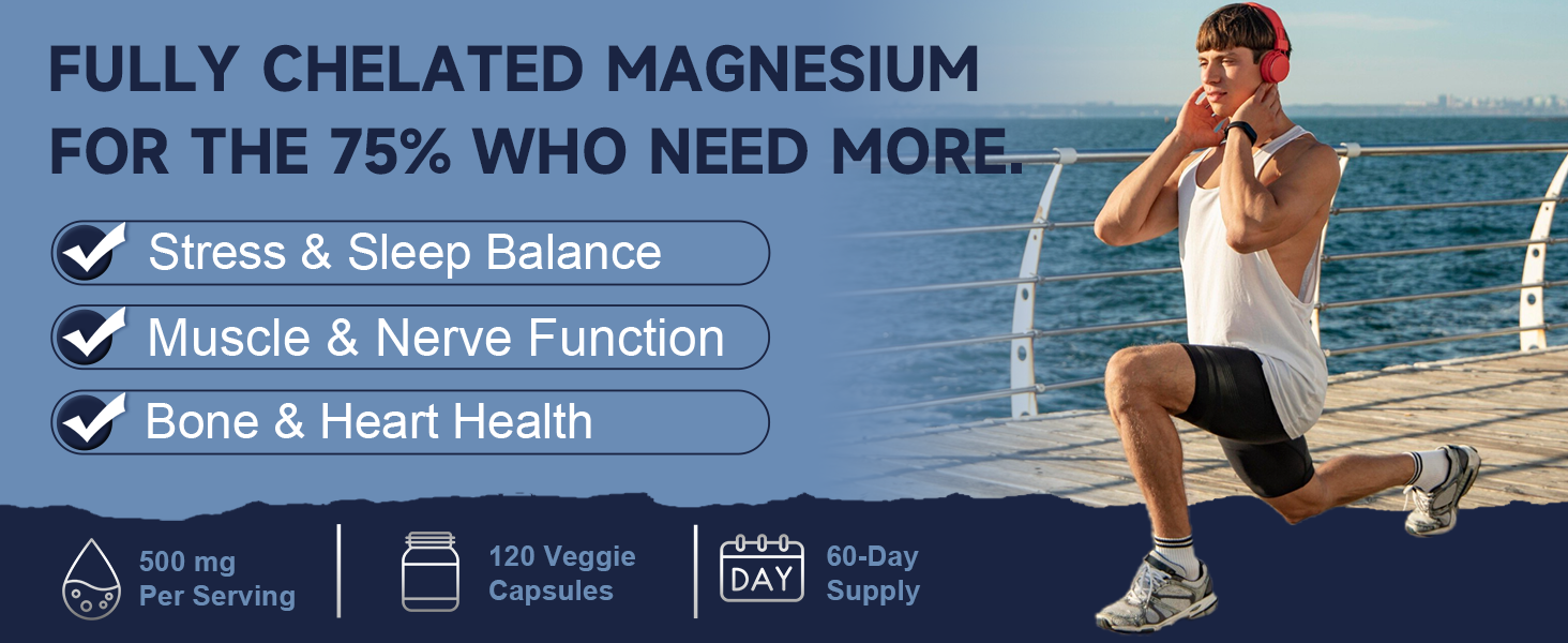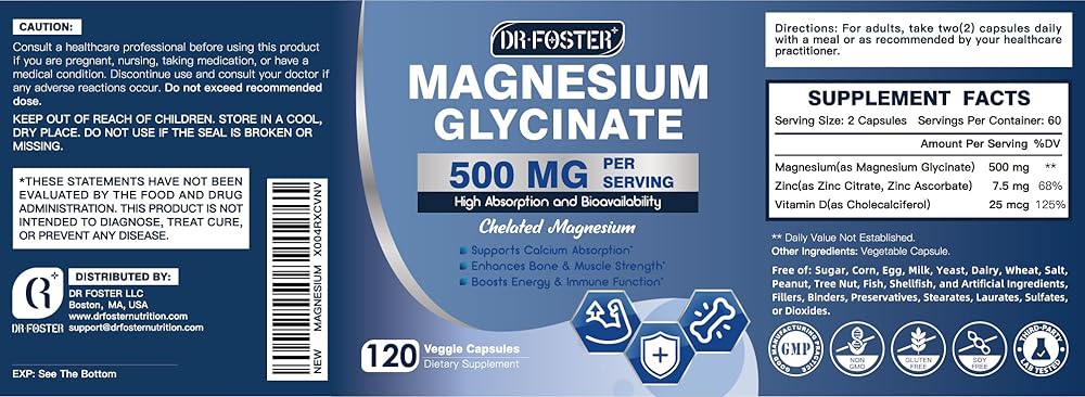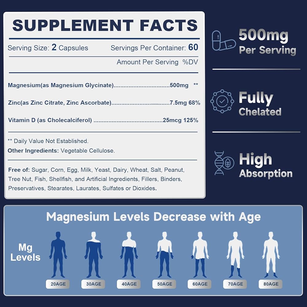 Golden Trio Formula: 2 daily capsules deliver 500mg of highly bioavailable chelated magnesium glycinate for adult needs. Fortified with synergistic Vitamin D3 and Zinc, ensuring superior absorption and maximum benefit to support your optimal wellness