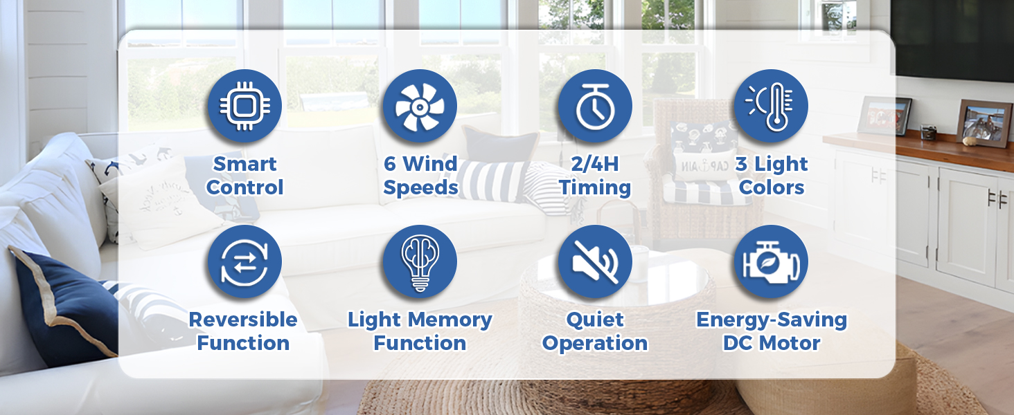 All-Season Availability: Sofucor ceiling fans with lights have a reverse airflow feature. In summer, living room ceiling fan blades rotate forward to bring coolness, and in winter, alexa ceiling fan blades are reversed to circulate warm air