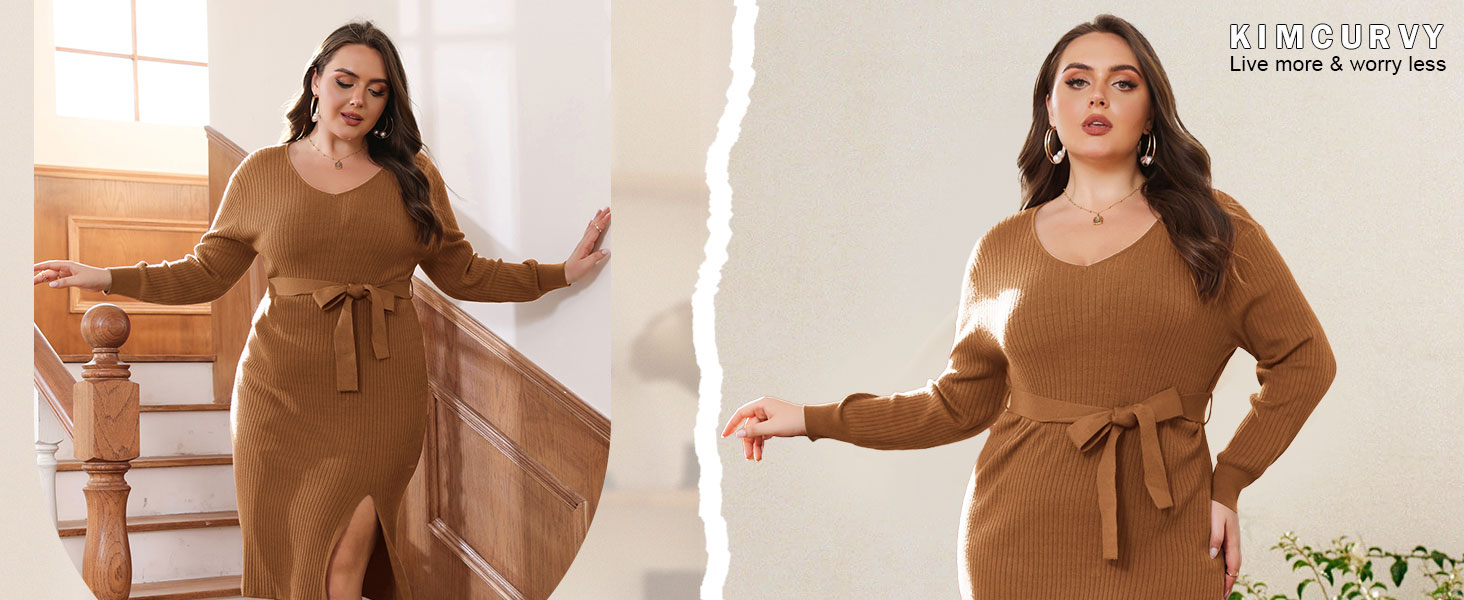 【Sexy V Neck】: This plus size winter sweater dress features a flattering V neck design and tie waist with a belt that adds a touch of elegance to your outfits.