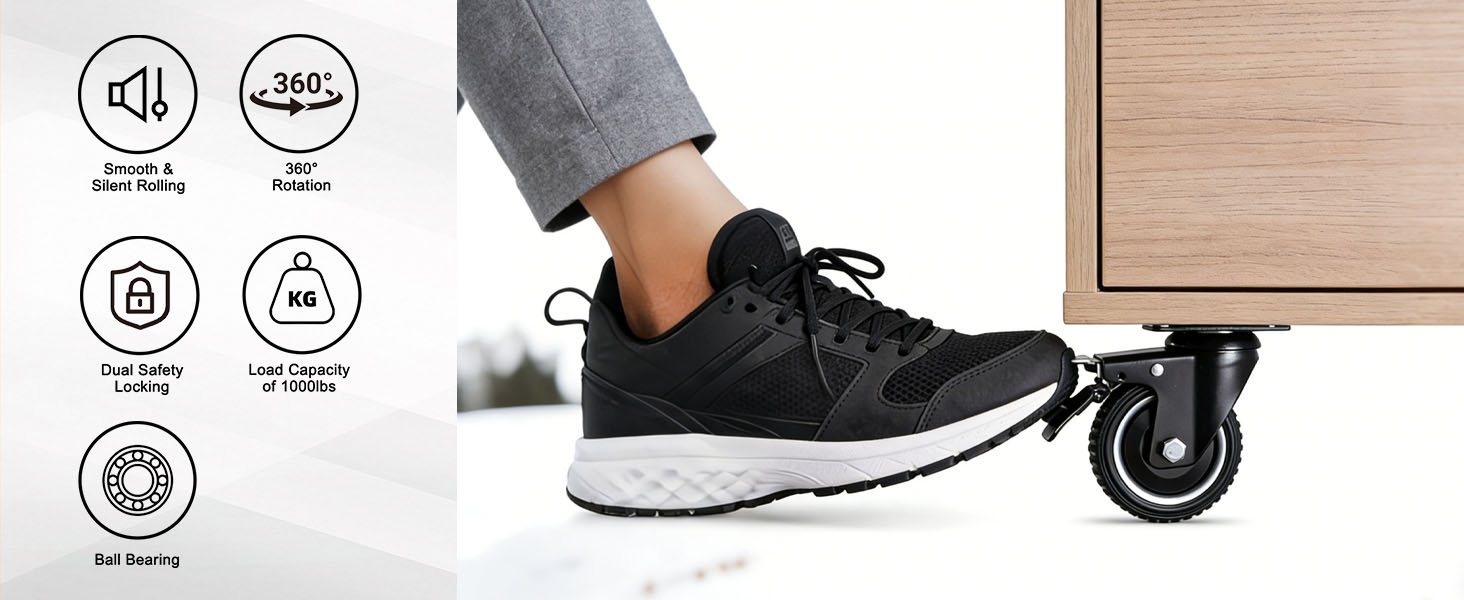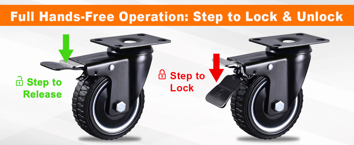 [DOUBLE LOCK BRAKE SYSTEM] Maximum safety for your equipment. Each of the 4 swivel casters is equipped with an independent dual-locking mechanism. A single press of the brake pedal simultaneously locks both the wheel's forward rolling and the top plate's 360-degree rotation, keeping your heavy workbench, tool box, or furniture firmly anchored in place without any sliding.