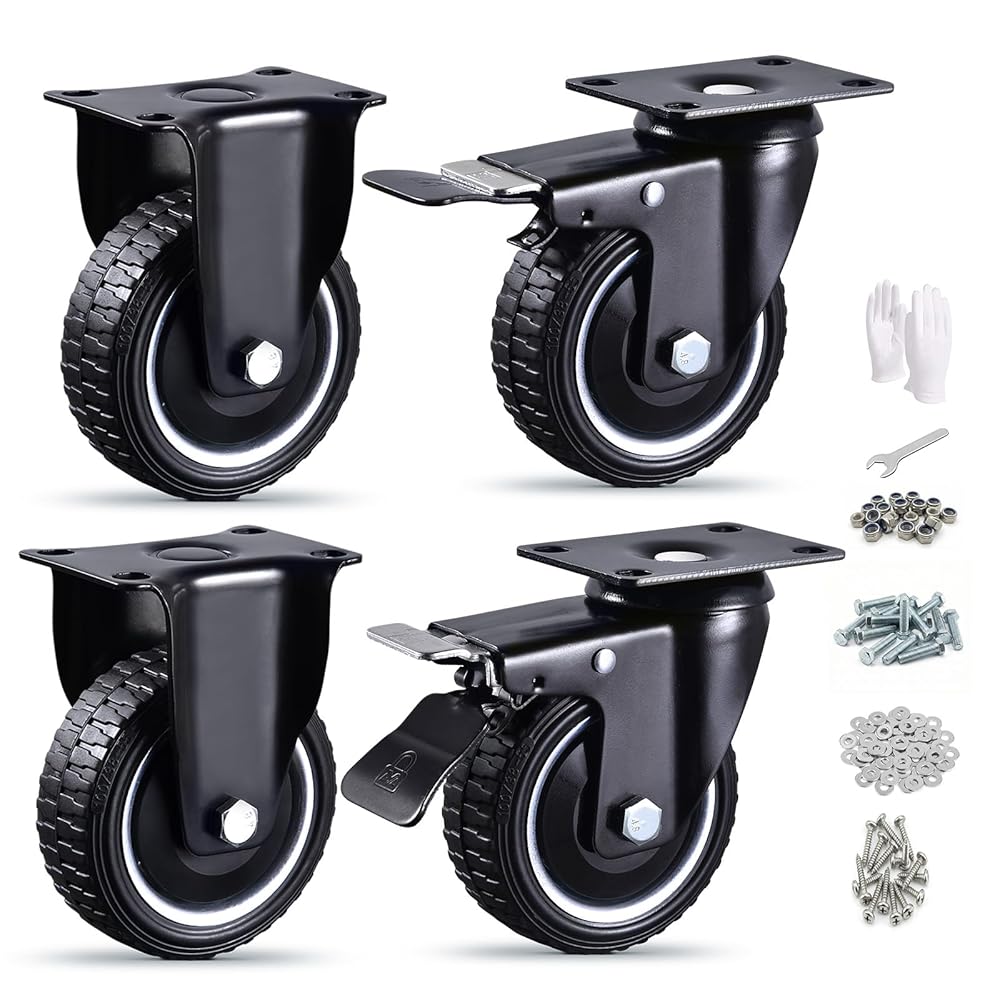 [SILENT RUBBER & FLOOR FRIENDLY] Engineered with high-strength industrial composite rubber, these heavy duty casters glide silently and smoothly. They are strictly will not leave scratches on hardwood, tile, or epoxy floors. The deep anti-slip tread patterns provide exceptional grip, making them highly controllable even on slippery surfaces or in noise-sensitive environments like offices and labs.