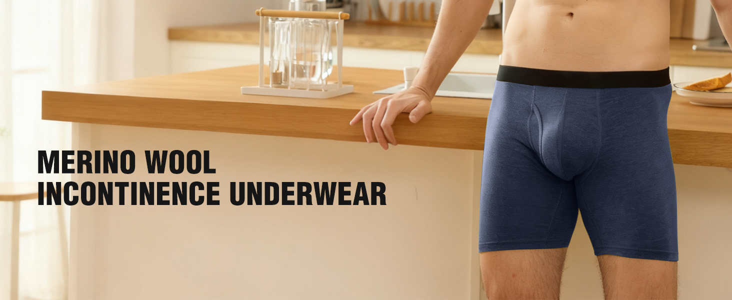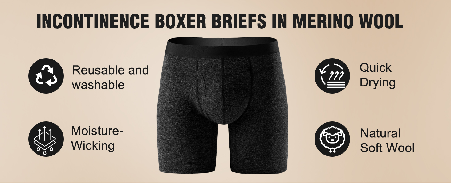 Our underwear features use Merino Wool for unmatched softness and next-to-skin comfort without itchiness. A specially designed absorbent briefs liner quickly pulls moisture away, locking it in to maintain a dry feel. Merino wool helps maintain a comfortable body temperature year-round, preventing overheating or chill.The low-profile design and quiet materials ensure your privacy. No one will know you're wearing them. The long legs boxer brief style provide full coverage and support. Choose comfort, discretion, and natural performance. Color have black gray grey blue. Size have M L XL XXL.