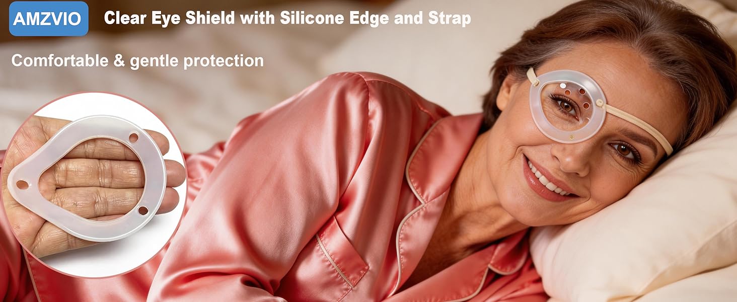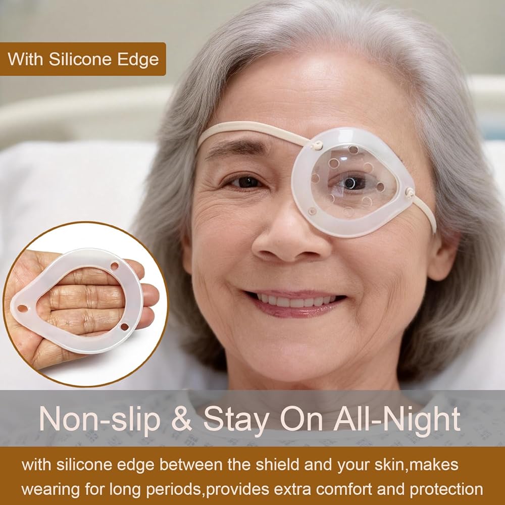 With Silicone Edge Non-slip: This 2 pack (one left, one right) cataract eye shields with soft silicone edge,comfortable and skin-friendly,and an adjustable elastic strap keeps the shield securely in place all night,kept your eyes safe from push, rub and nightime pillow pokes