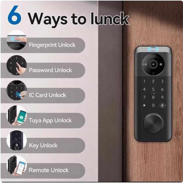 • 6 in 1 Convenient Keyless Entry Door Lock: The WiFi smart door lock offers 6 smart ways to unlock your door via two-way audio via camera, 50 fingerprints, 50 passwords, Tuya App remote control, Alexa voice, and a spare key, providing your family with a variety of door opening options to meet your diverse needs