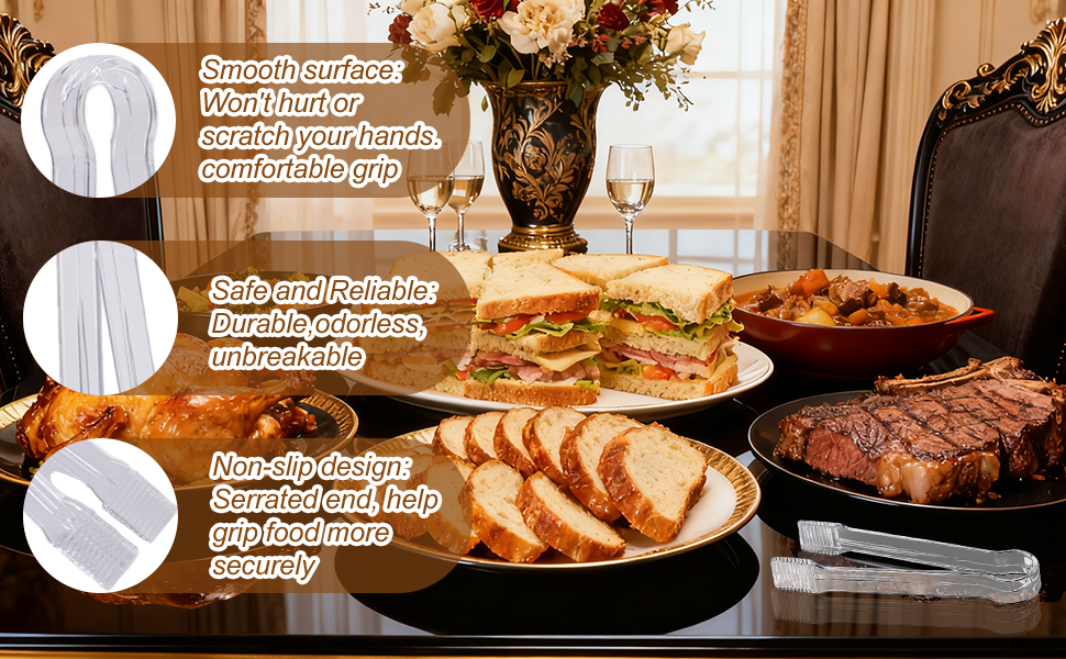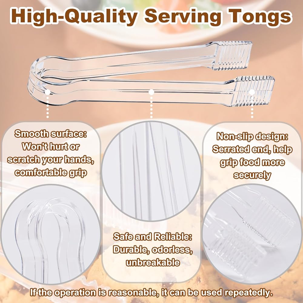 【Safe and Durable Material】Clear tongs are made of high-quality plastic, odorless, safe to use confidence. The thoughtful serrated end design lets you grip food firmly, preventing it from falling off easily