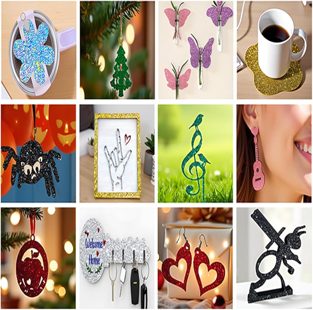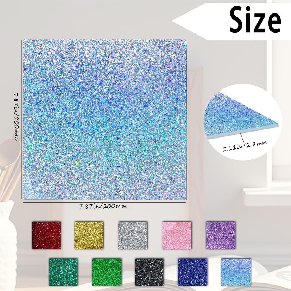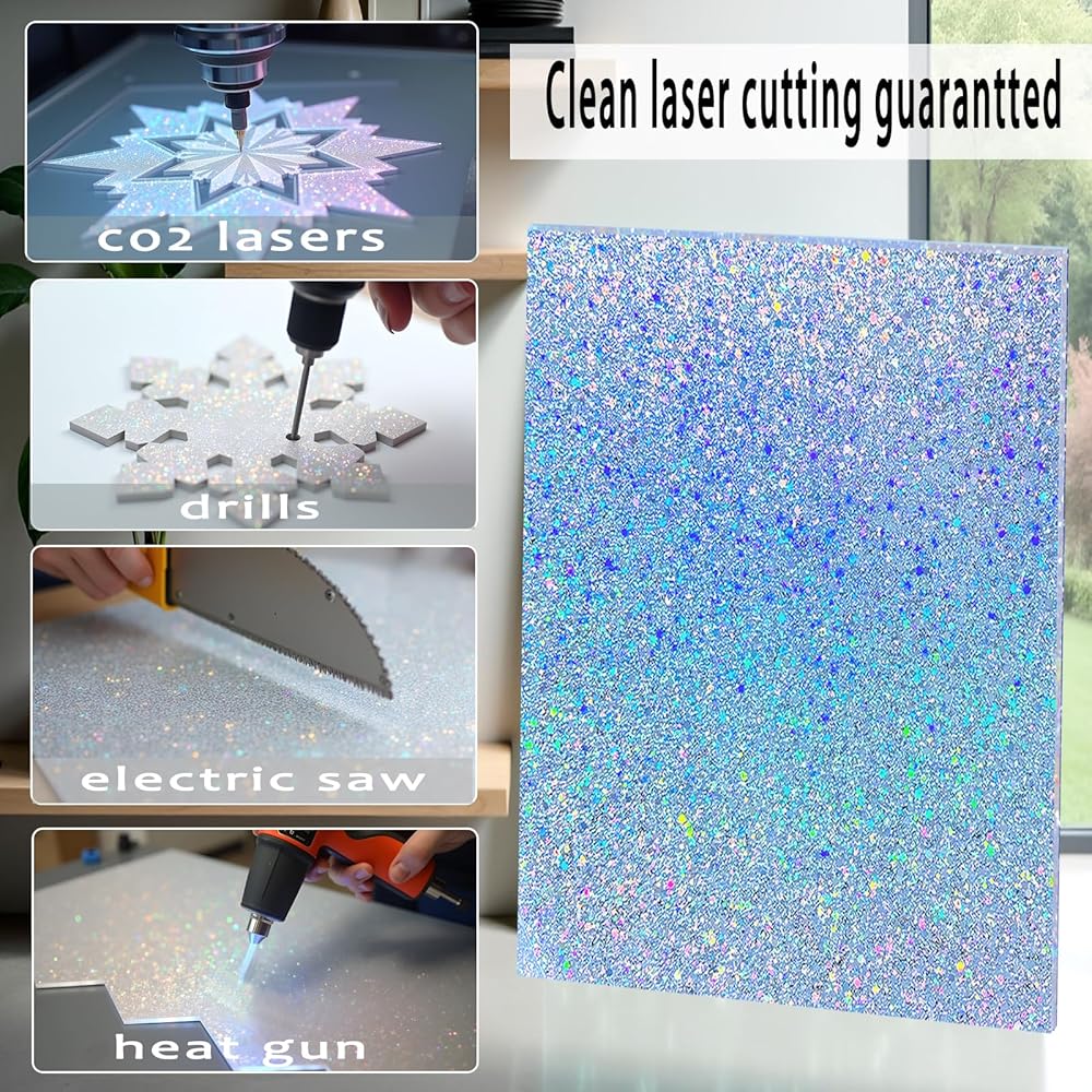 Full Glitter Effect: Premium PMMA acrylic with glitter embedded throughout, creating a sparkling and dazzling effect on both sides of the acrylic boards. Note: The glitter acrylic panels are translucent with high light transmittance, so they are not compatible with diode lasers