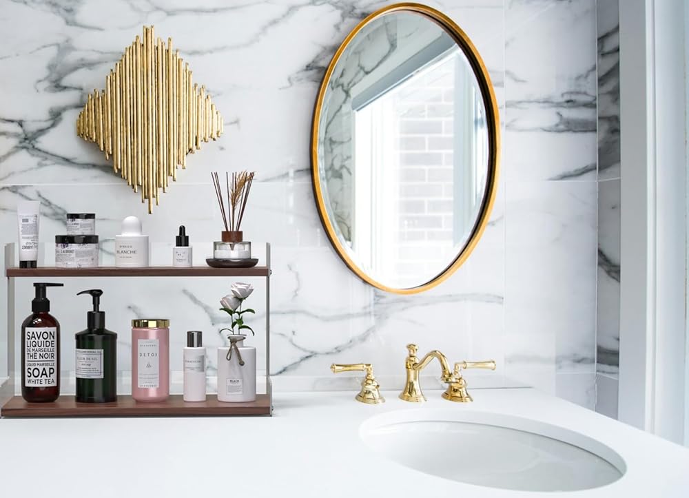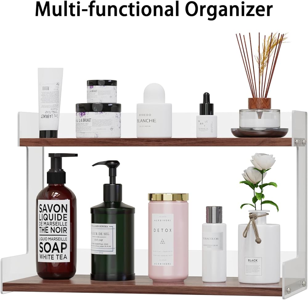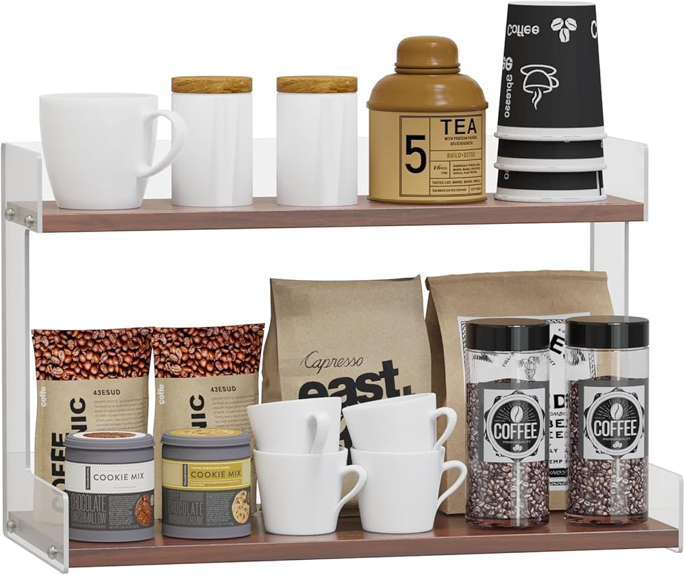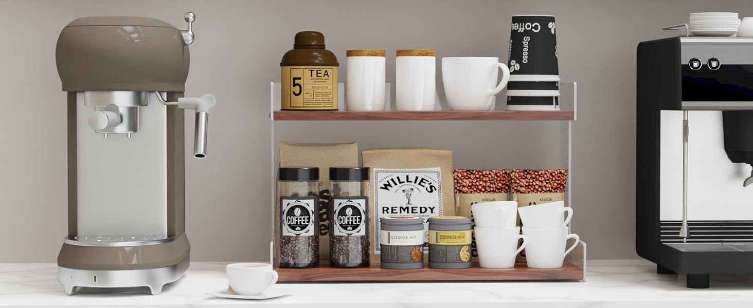 Large Storage Capacity & Multi - Purpose Use: This two - tiered countertop organizer rack features two wooden shelves, each with a length of 16" and a width of 4.5" /7.6". It offers ample space to hold a wide range of items. You can store coffee bar accessories like coffee mugs, coffee paper cups, sugar packets, coffee bags, tea bags, and spice jars. Additionally, it's perfect for holding bath supplies such as shampoo, body wash, laundry detergent, and scented candles, as well as beauty products including makeup, perfume, nail polish, and skincare items . It's a highly versatile storage solution.