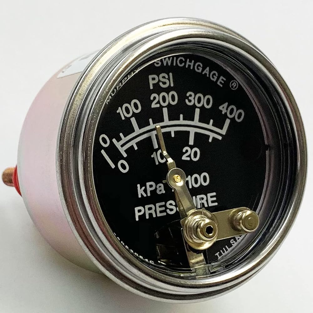 The 20P-400 Pressure Swichgage is a 2" dial, diaphragm-actuated pressure-indicating gage with a built-in electrical limit switch, which is used for tripping alarms and/or shutdown devices. This dual-scale instrument has a range of 0-400 psi (2.8 MPa) [28 bar]. The gage mechanism is enclosed in a steel case coated to resist corrosion. A polycarbonate, break-resistant lens and a polished, stainless steel bezel help protect this rugged instrument. Accuracy and protection from moderate overpressure is assured by a unique, unitized diaphragm chamber. A built-in pulsation dampener helps eliminate pointer flutter and is removable for cleaning. Inside the 20P-400, the gage pointer acts as a pressure indicator and as one switch pole which completes a circuit when it touches the adjustable limit contact. Contacts are grounded through the case and have a self-cleaning motion to ensure electrical continuity. The 20P-400 Pressure Swichgage? was specifically designed to protect engines and equipment in oil field, marine, irrigation, construction and trucking applications by monitoring engine lube pressure, water pump pressure, hydraulic pressure and air pressure. This popular instrument features a beryllium copper diaphragm, a 1/8-27 NPTM brass process connection, and exceeds SAE standards.