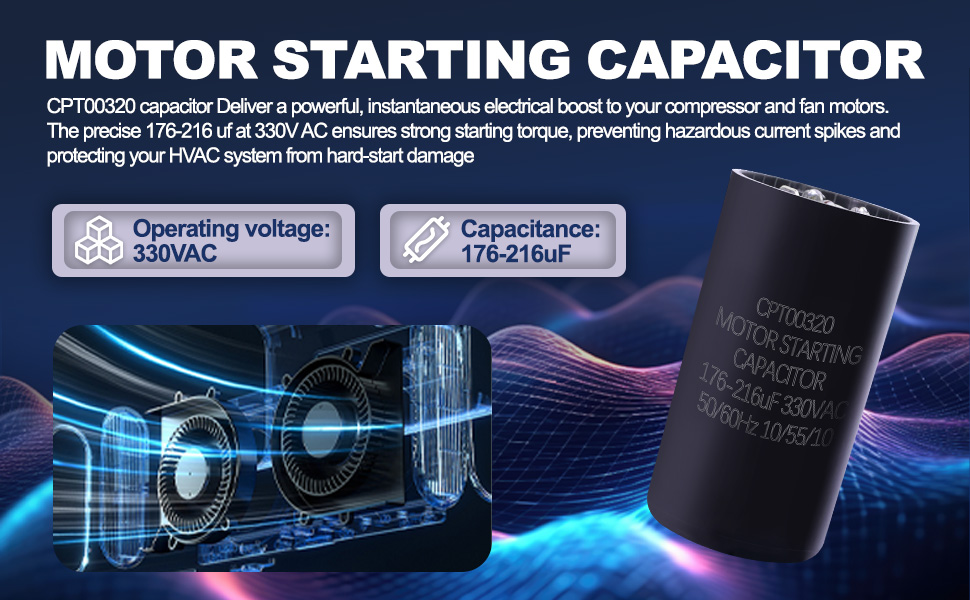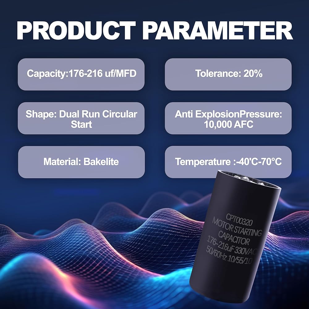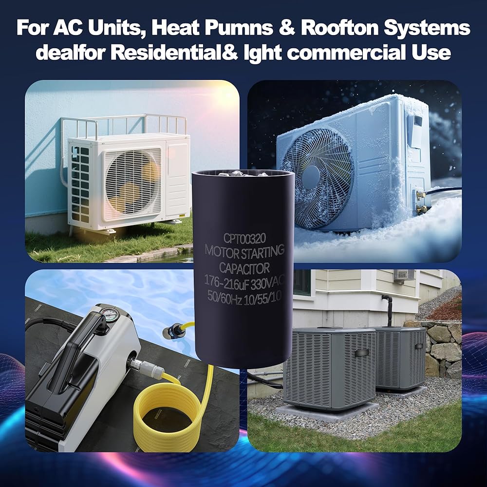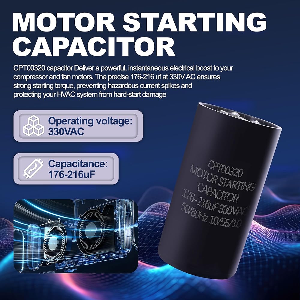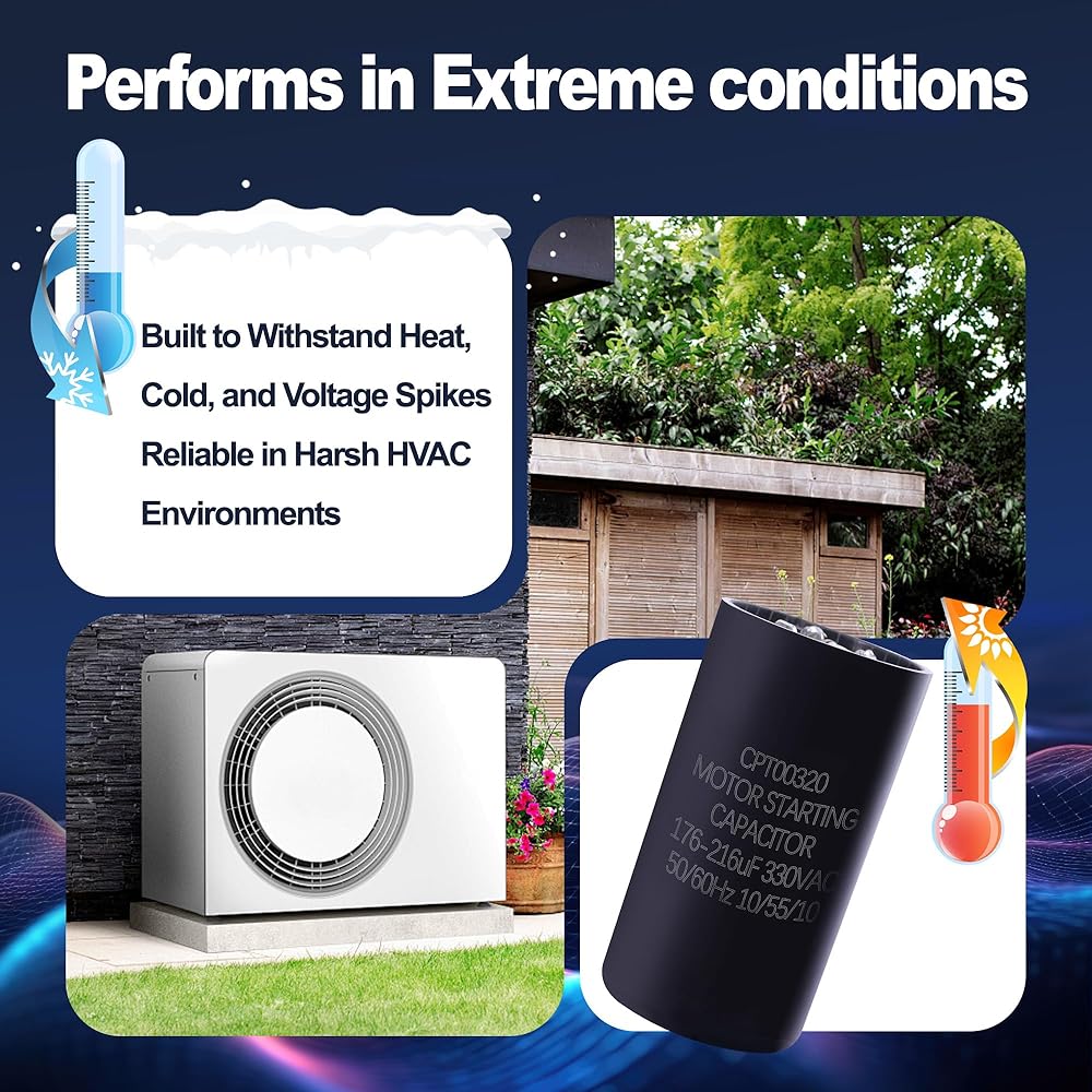 Stable Performance: Features a 176-216 MFD capacitance and a 330 VAC voltage rating. This wide operating range ensures stable, optimal performance and reliable starting power for your compressor and fan motor under various conditions