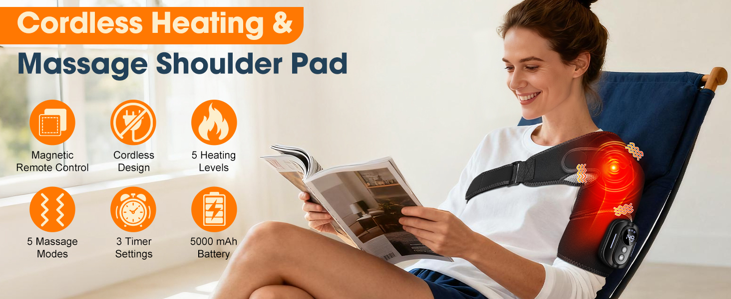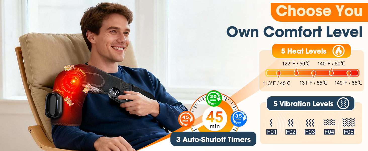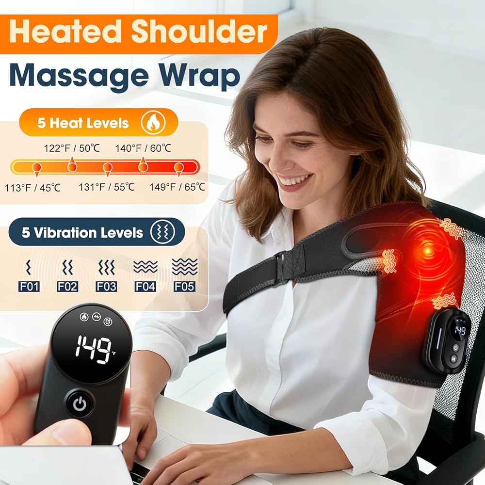 RELIEF FOR SHOULDER PAIN: The electric shoulder heating pads combines 5 adjustable heat settings (113℉/45°C-149℉/65°C) and vibration massage to effectively alleviate shoulder discomfort and promote circulation. You can choose to use the heating or vibration massage functions separately or simultaneously. With multiple intensity levels to choose from, personal comfort levels may vary—please select the function and mode that feel best for you. Note: The vibration mode is not suitable for those with traumatic shoulder injuries.