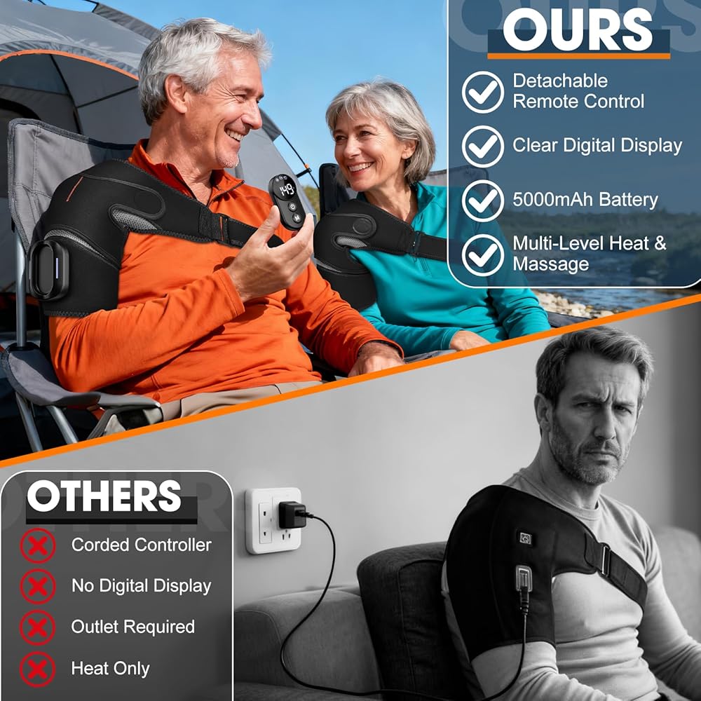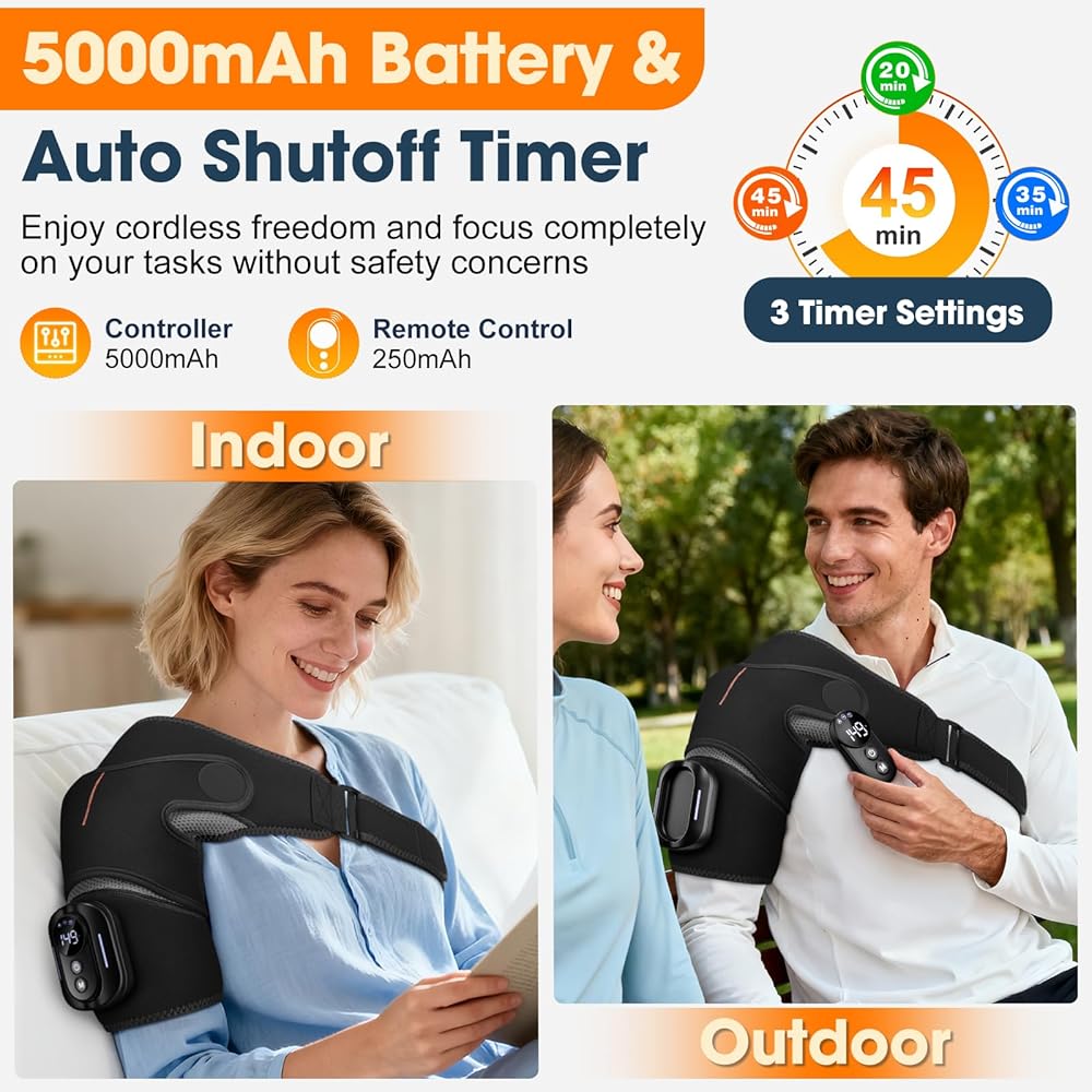 CORDLESS SHOULDER HEAT PAD FOR USE ANYWHERE: The cord-free design liberates you from the hassle of being tethered to a charging cable. It can be used anytime, anywhere, and is highly portable—perfect for wearing while working, traveling, or during outdoor activities. Our design is also aesthetically pleasing, with a classic black color that complements any outfit.