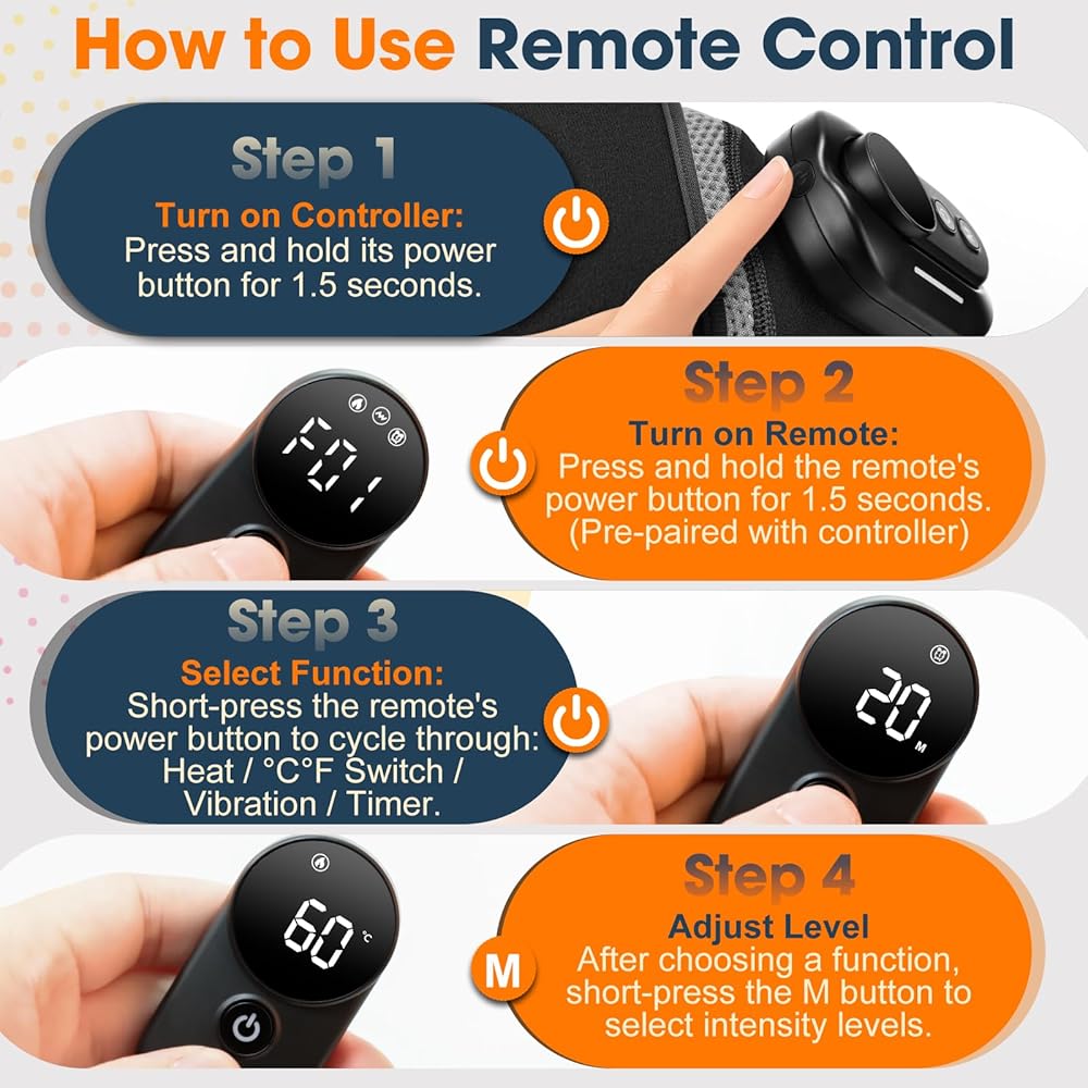 FRIENDLY REMOTE DESIGN:The magnetic, detachable remote is easy to operate, unlike older heating shoulder wraps that were difficult to control once worn. For first-time use, please take a moment to know the instructions. The button layout is simple, but we recommend familiarizing yourself with it to get comfortable. Users from 8 to 80 can quickly learn to use the controls.