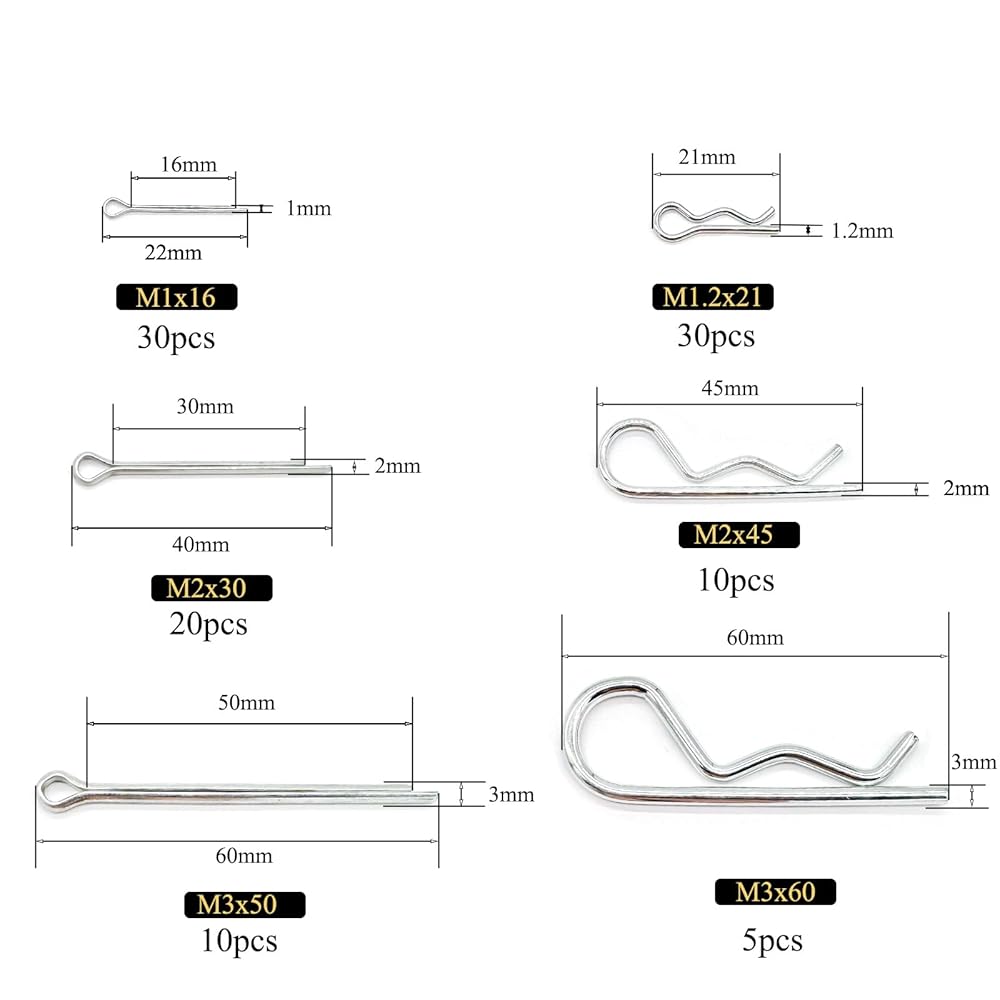 【105 Pcs in 6 Sizes】R Pin:M1.2x21(30Pcs),M2x45(10Pcs),M3x60(5Pcs).Cotter Pin:M1x16(30Pcs),M2x30(20Pcs),M3x50(10Pcs).6 sizes split pins & r clips assortment kit contains range of sizes wide M1-M3 lenght 16mm-60mm, Rich size to meet the needs of different uses.