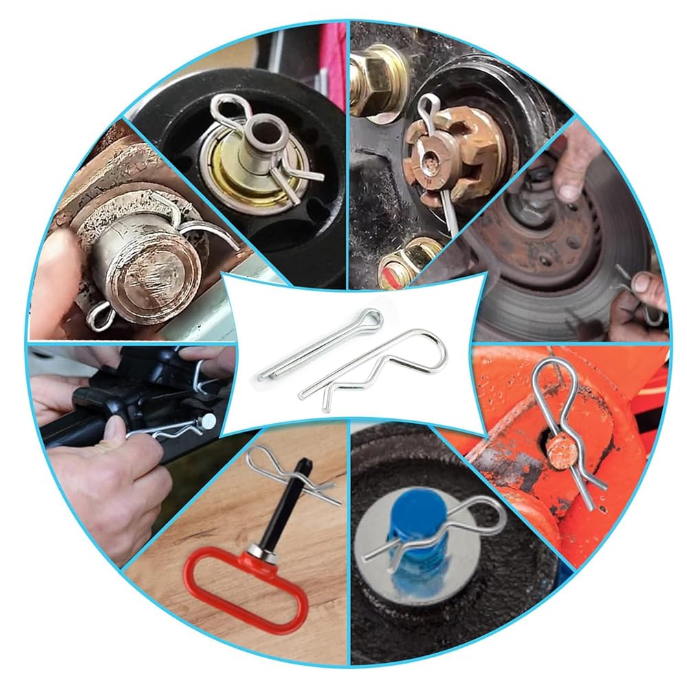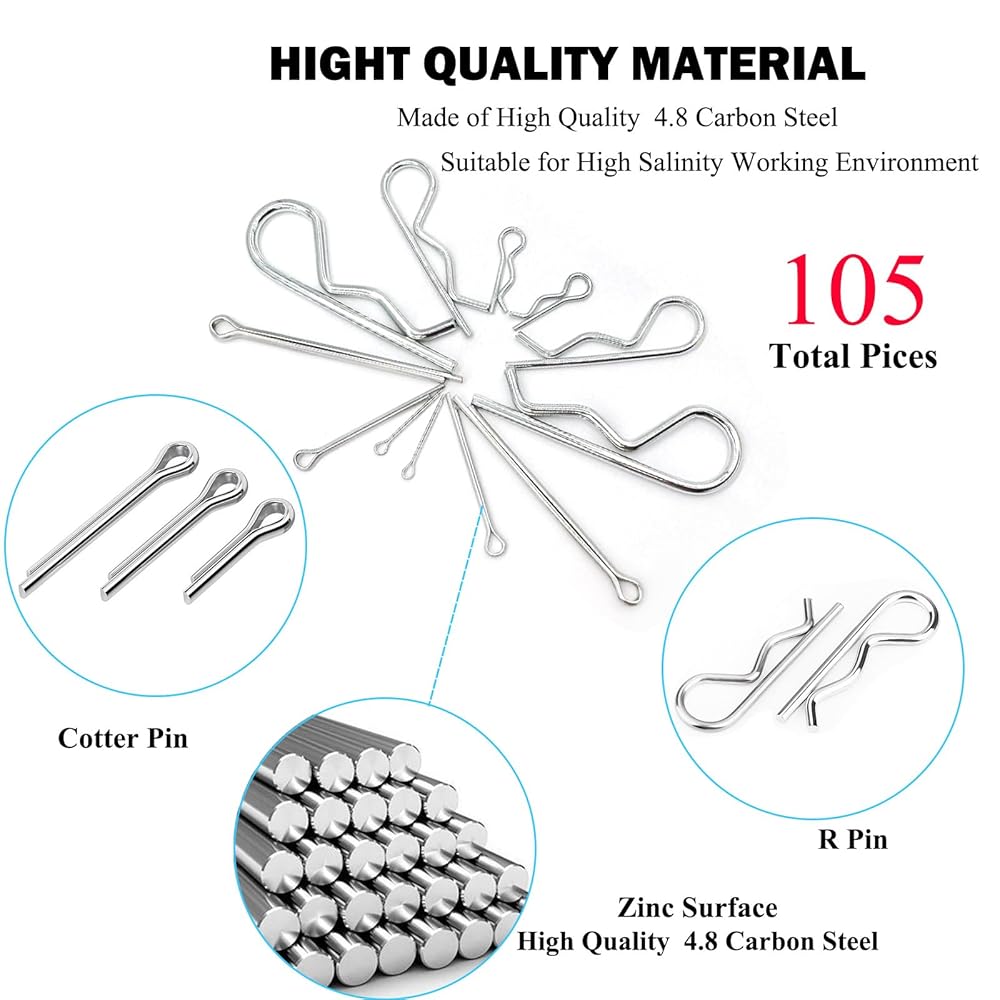 【Secure Fastening】Because of a strict metal composition and consummate casting skill. R pins have high hardness and strong spring tension. Once these are in place they last,easy installation and disassembly, reusable. Cotter pin design: fast, Safe and effective locking bolt, uniform force, not easy to slip, used to prevent relative travel, will not fall off.