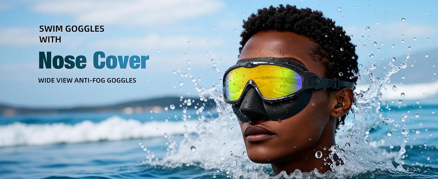 🏊Panoramic HD Wide View & No Raccoon Eyes - Aegend swimming goggles with nose cover offer an ultra-wide 180-degree view, giving you a crystal-clear and expansive perspective of your surroundings, making your swimming experience safer and more enjoyable. The soft silicone is worn around the face and doesn't leave marks after wearing, suitable for all face shapes, and this curvature is more suction and leak-proof! With our swim goggles, you can explore the underwater world with ease.